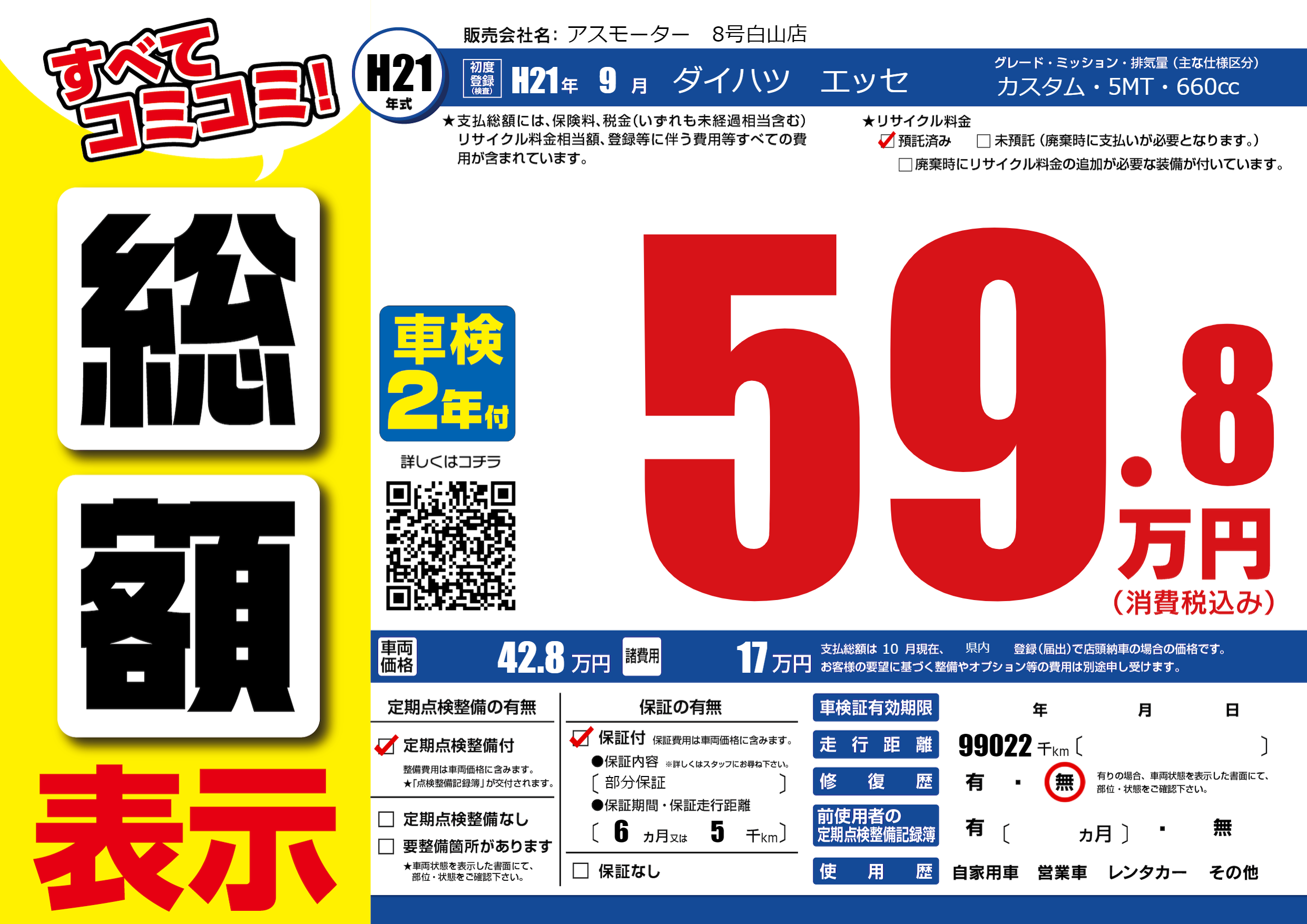 | 車名 | ダイハツ エッセ | グレード ミッション 排気量 |