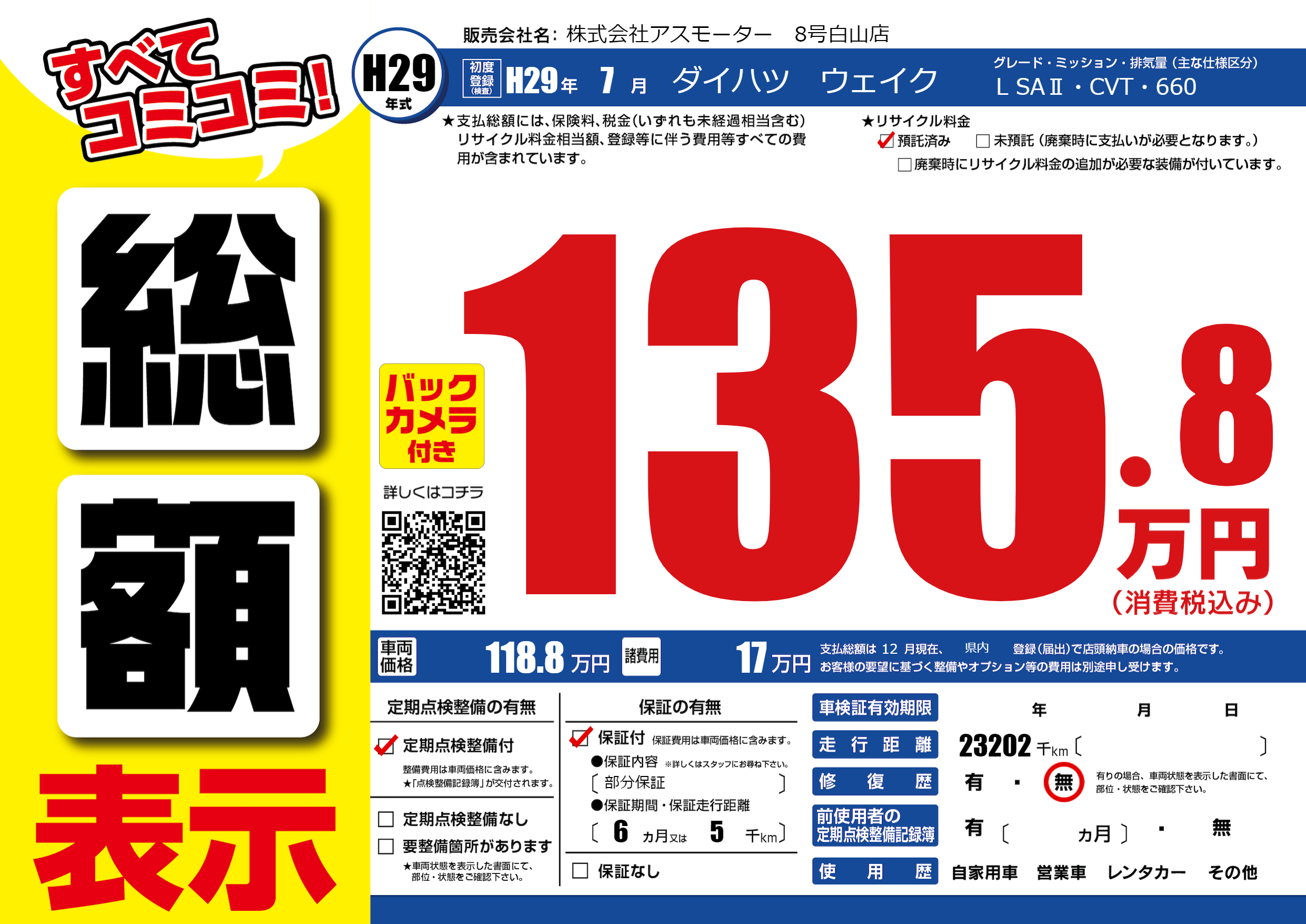 | 走行キロ | 2320.2万km | 初年度登録 | H29年7月 |