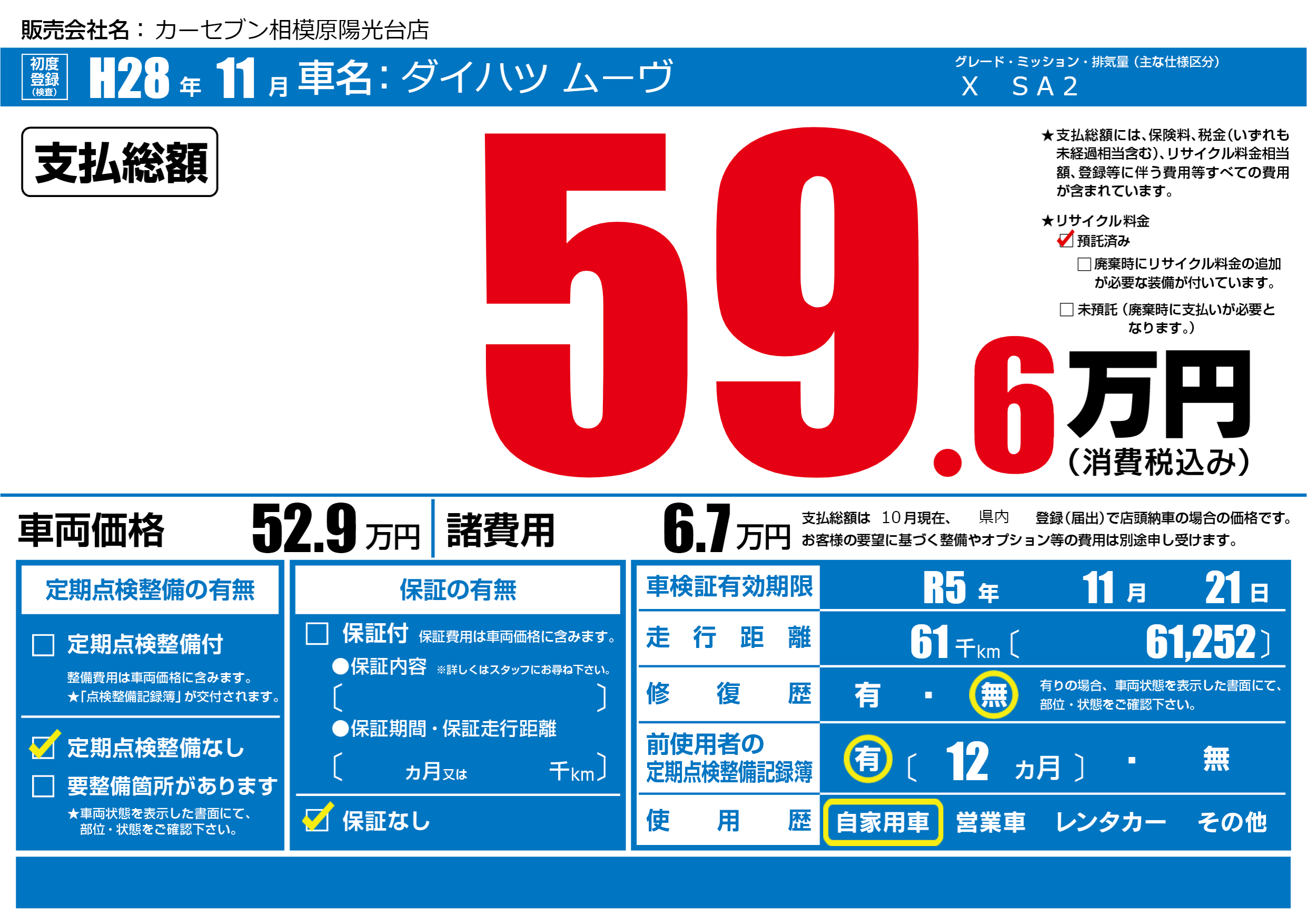 なし | 車検制限 | R5年11月21月 |