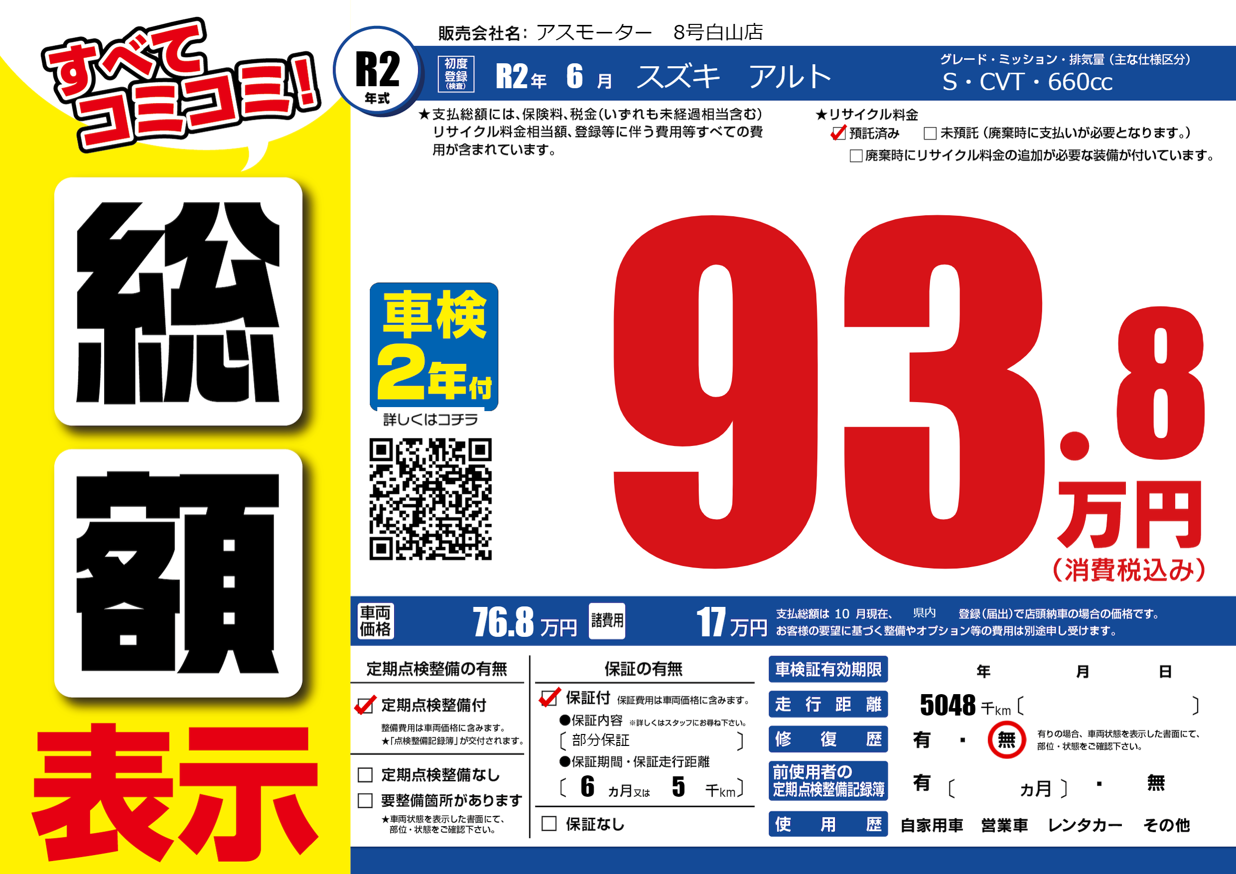 | 車名 | スズキ アルト | グレード ミッション 排気量 |