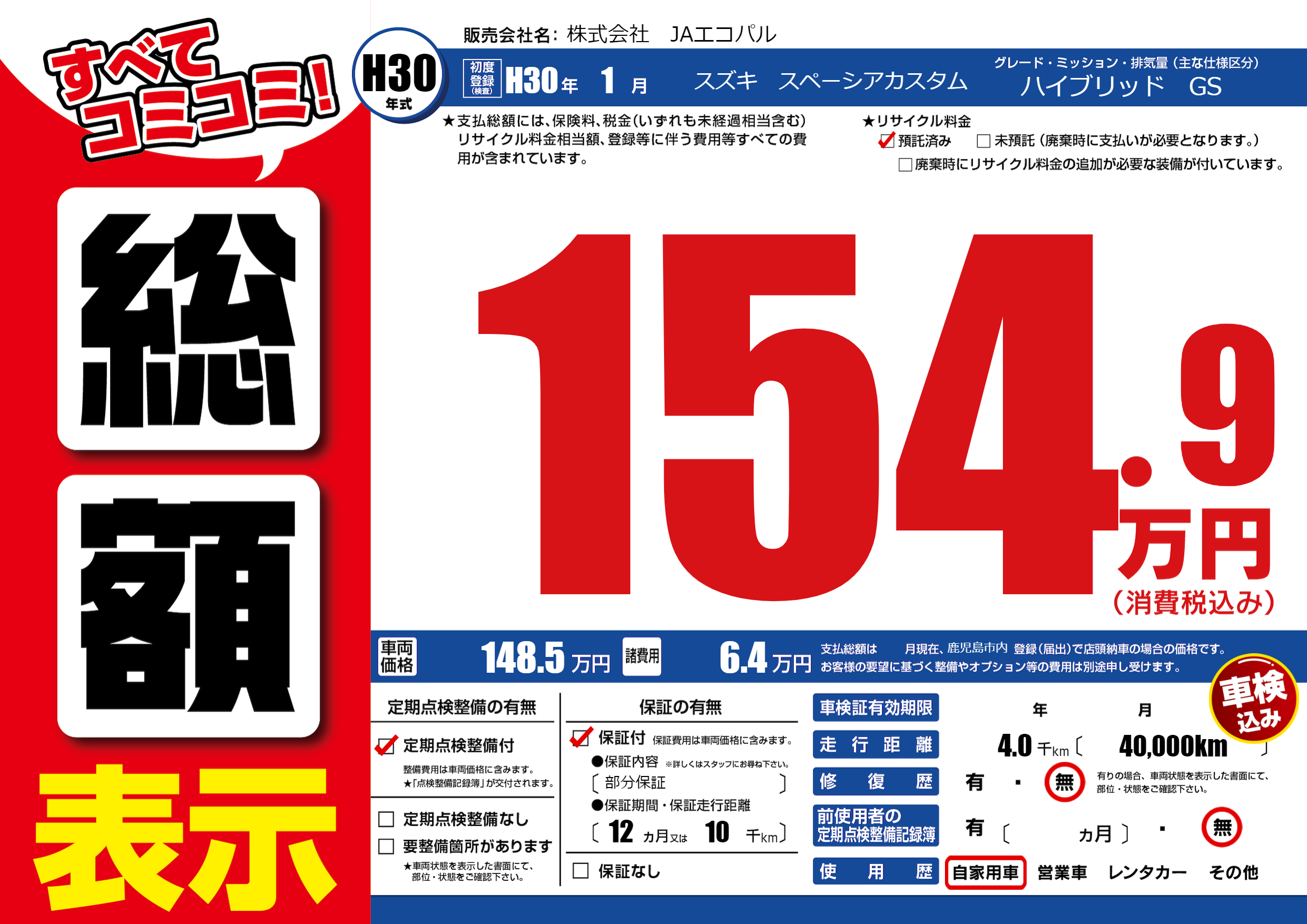 | 走行キロ | 0.4万km | 初年度登録 | H30年1月 |