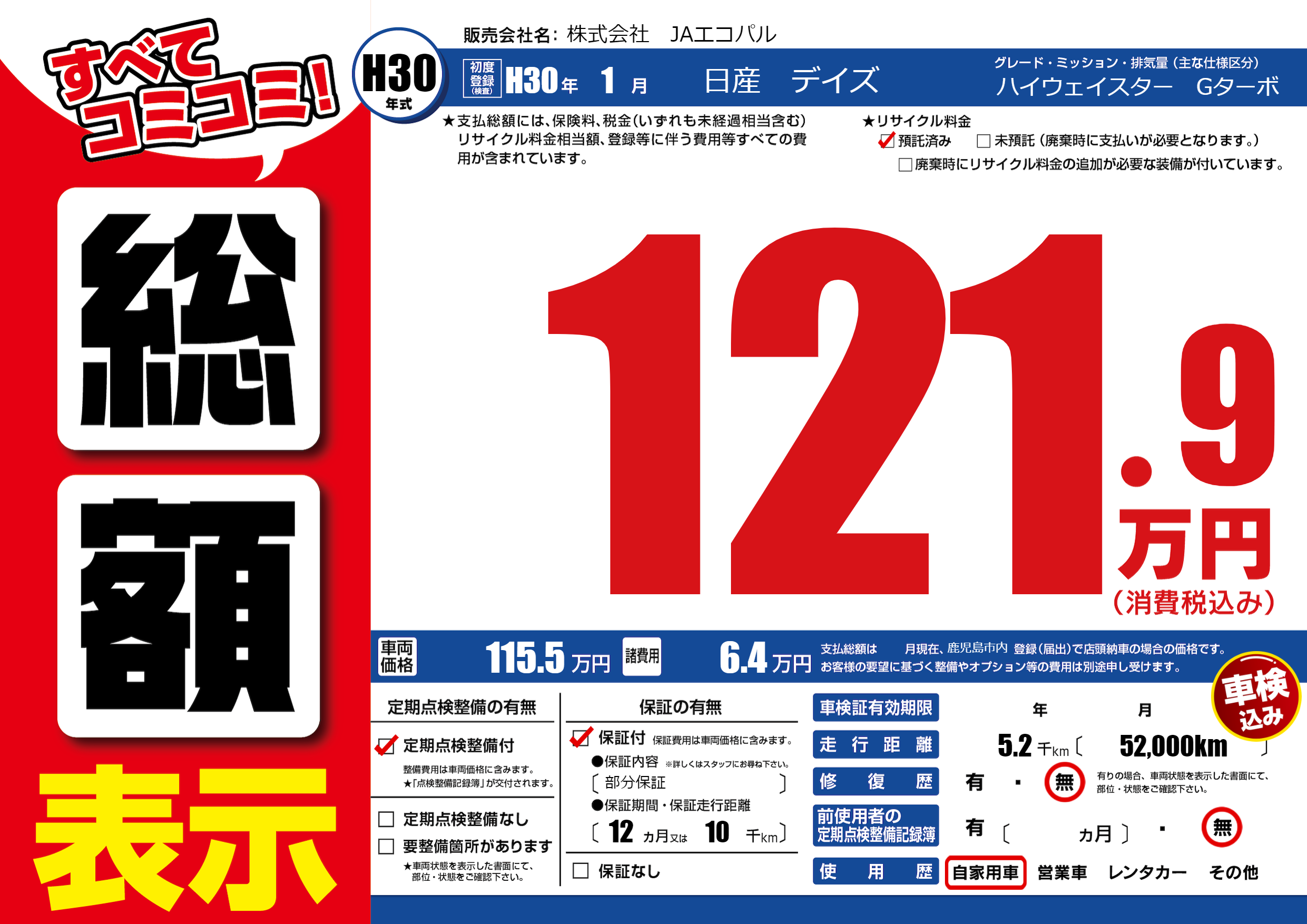 | 車名 | 日産 デイズ | グレード ミッション 排気量 |