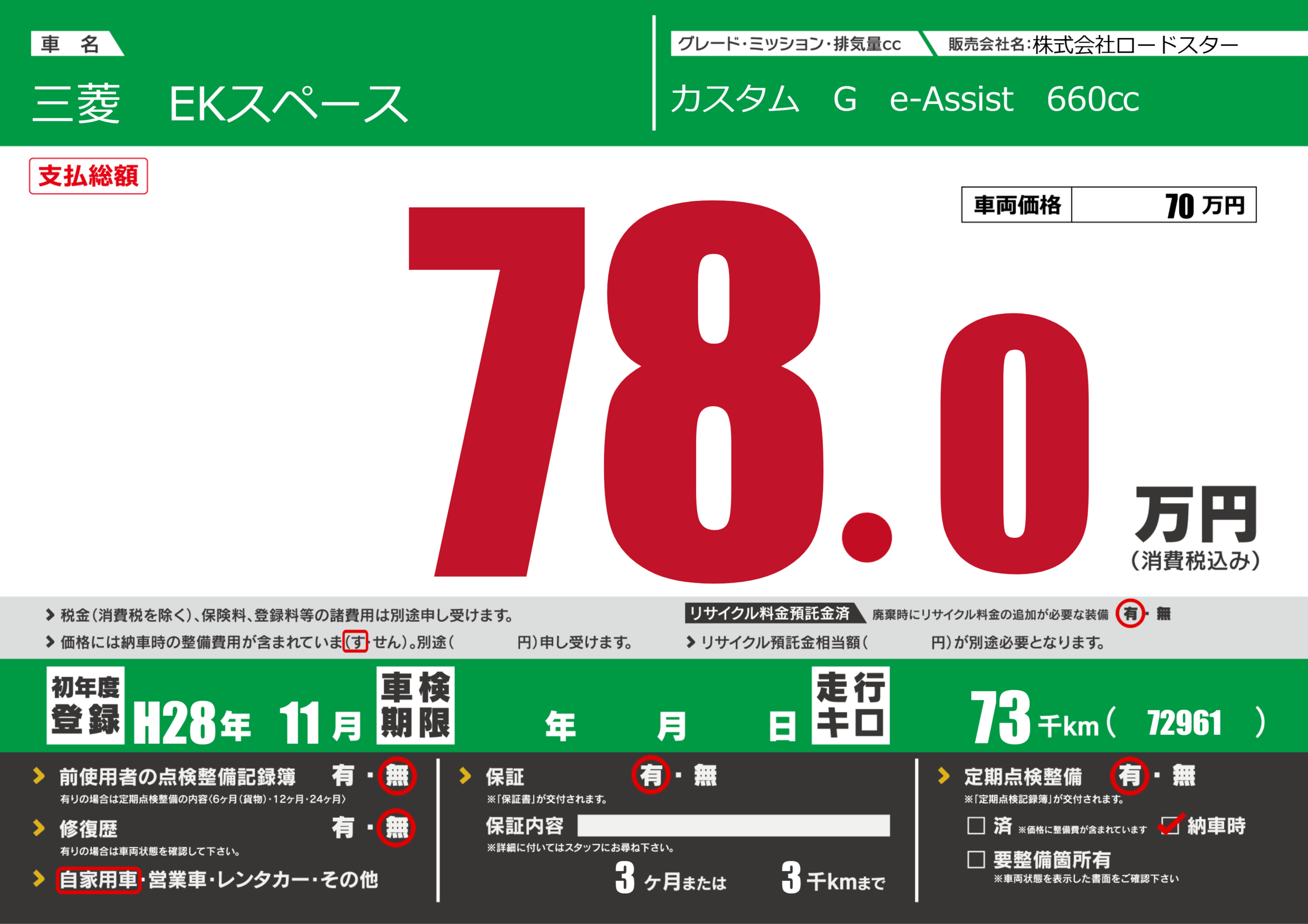 | 定期点検整備 | 定期点検整備あり 納車時あり | ||