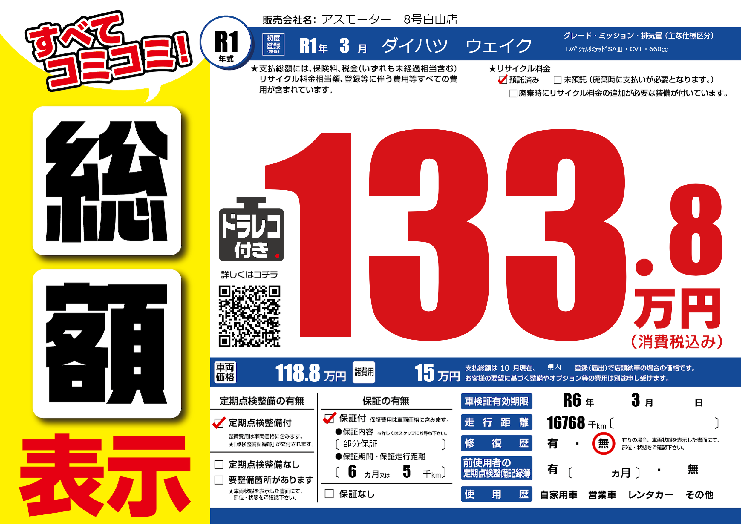 | 走行キロ | 1676.8万km | 初年度登録 | R1年3月 |