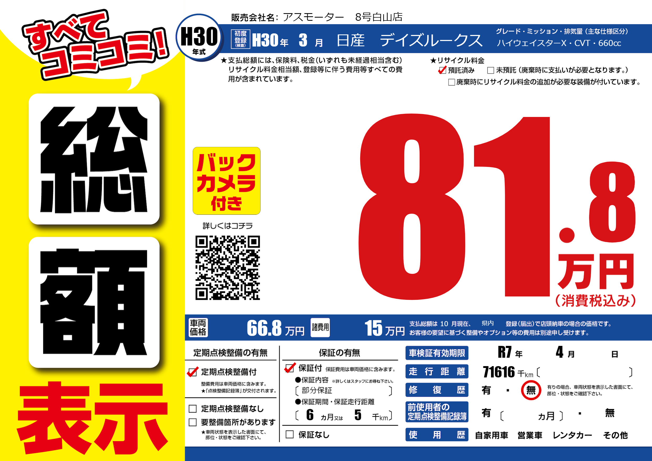 | 車名 | 日産 デイズルークス | グレード ミッション 排気量 |