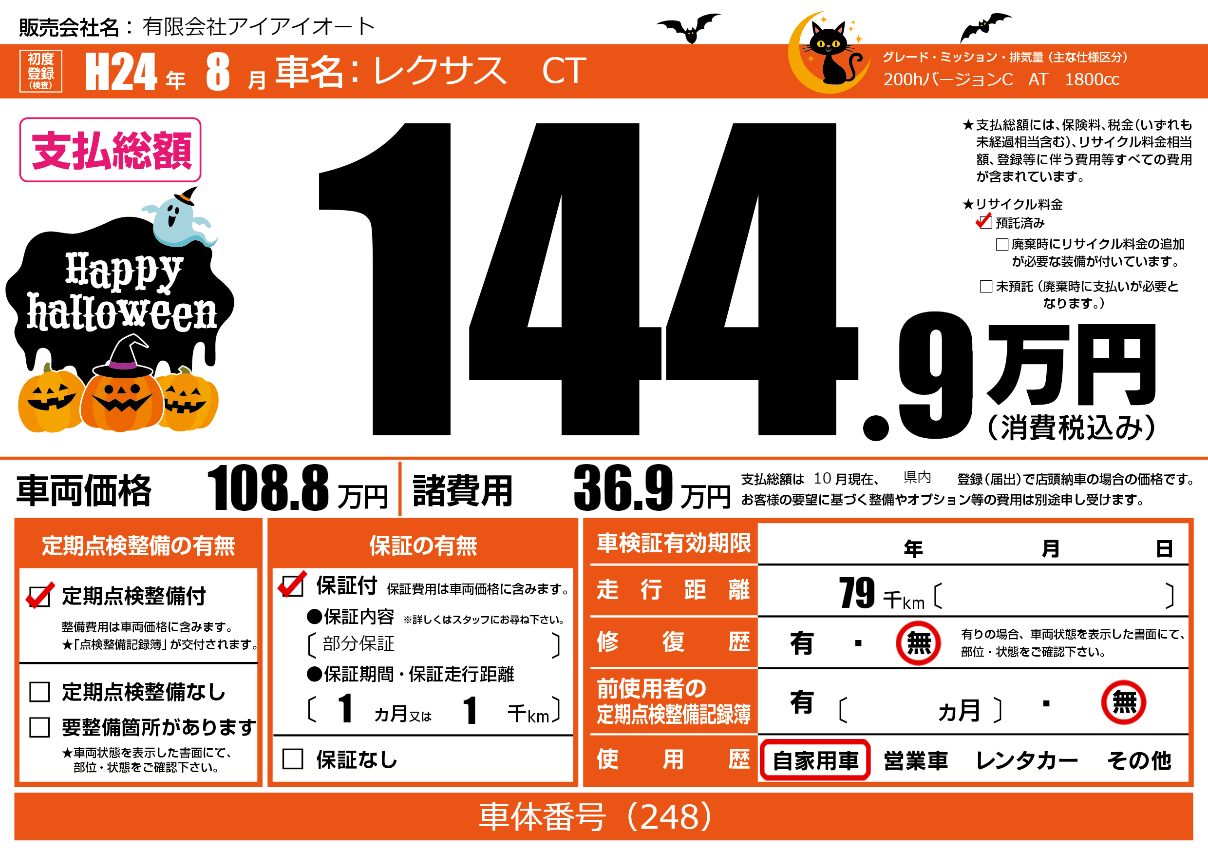 | 走行キロ | 7.9万km | 初年度登録 | H24年8月 |