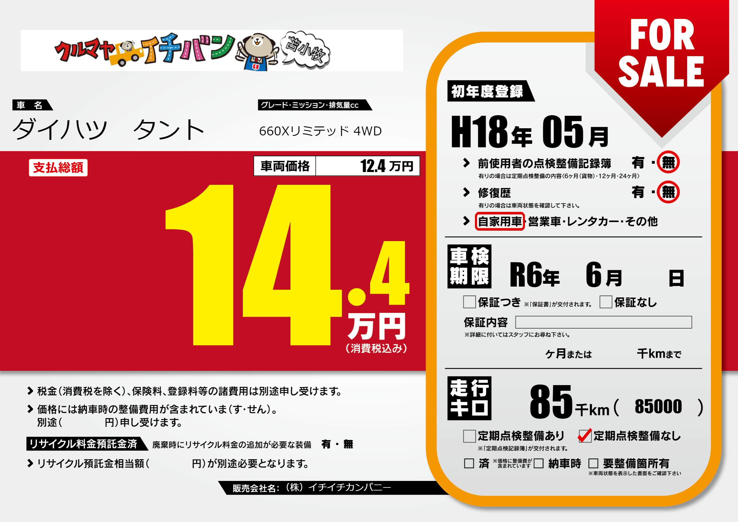 | 車名 | ダイハツ タント | グレード ミッション 排気量 |