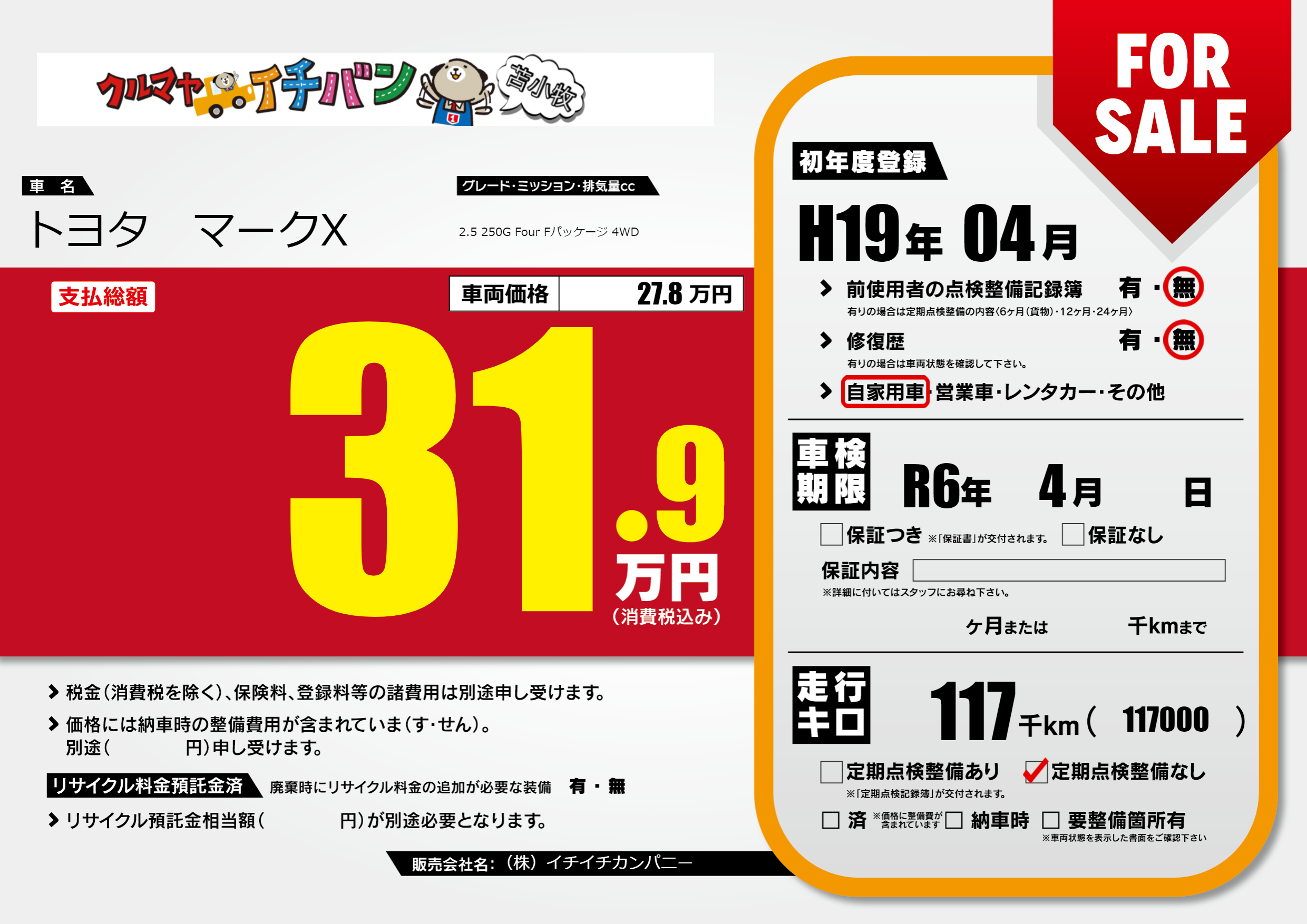 | 車名 | トヨタ マークX | グレード ミッション 排気量 |