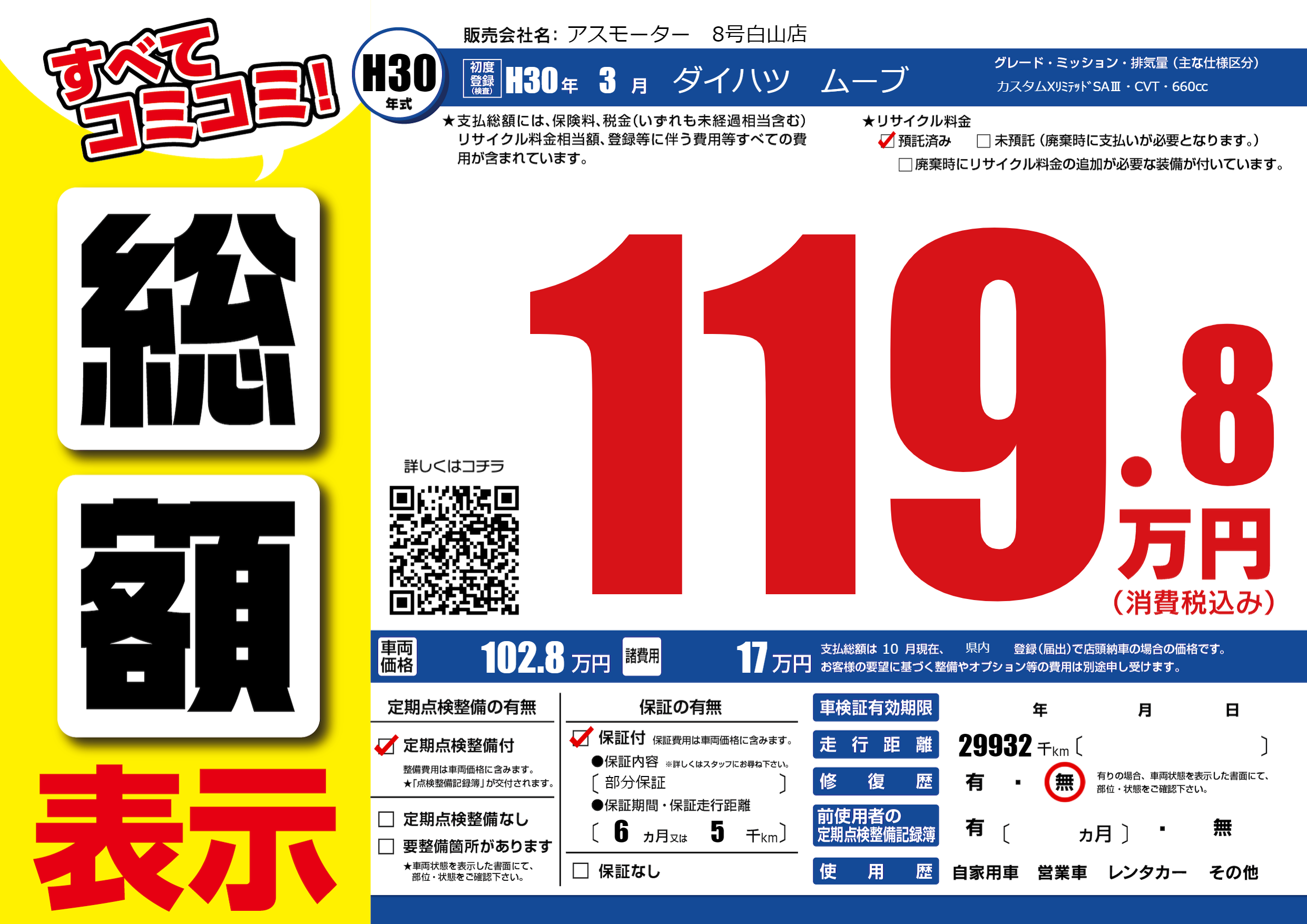 | 走行キロ | 2993.2万km | 初年度登録 | H30年3月 |