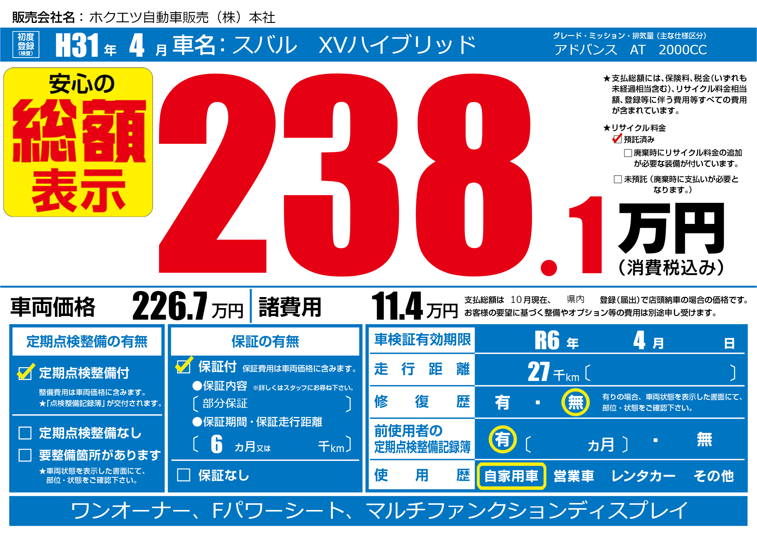 | 車名 | スバル XVハイブリッド | グレード ミッション 排気量 |