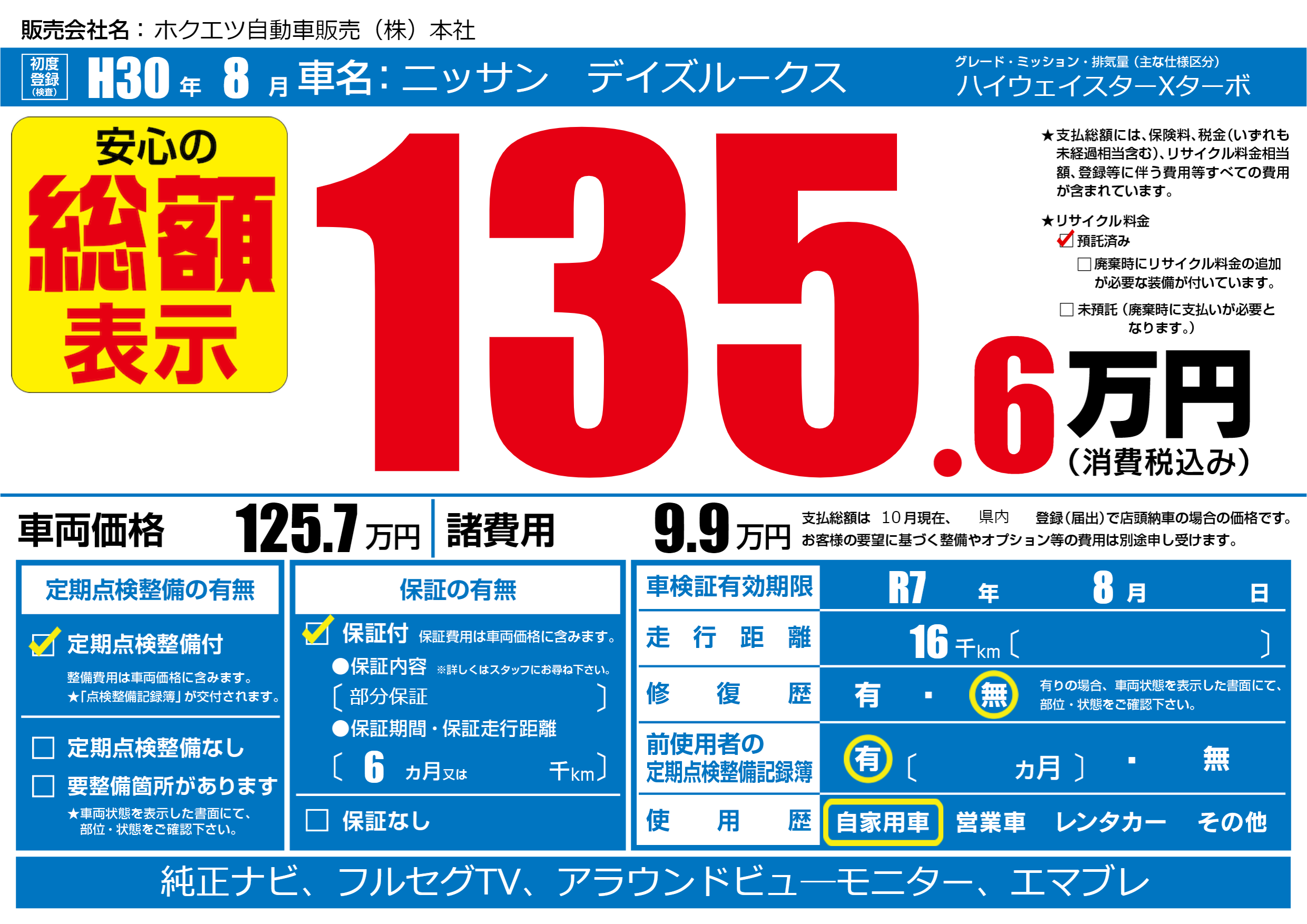 | 車名 | ニッサン デイズルークス | グレード ミッション 排気量 |