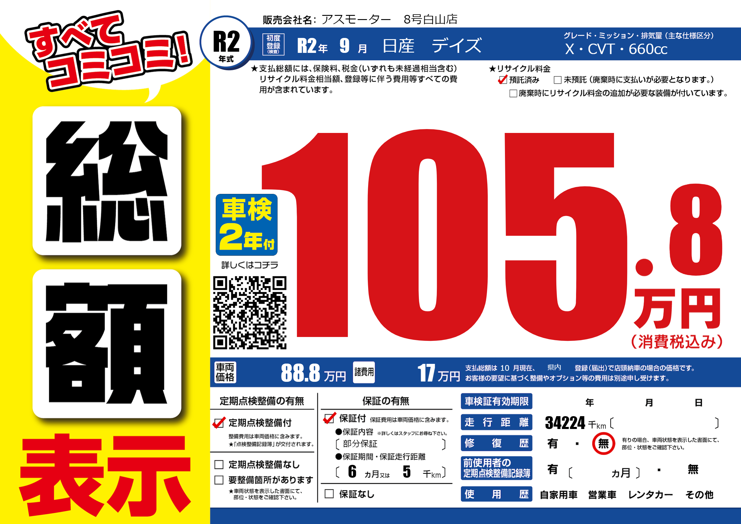 | 車名 | 日産 デイズ | グレード ミッション 排気量 |