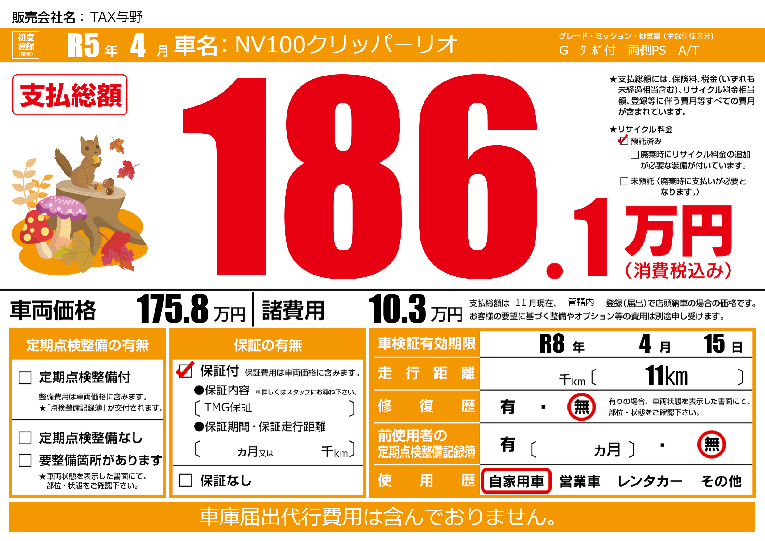 保証付き 保証内容(TMG保証) ---ヶ月または()千kmまで |
