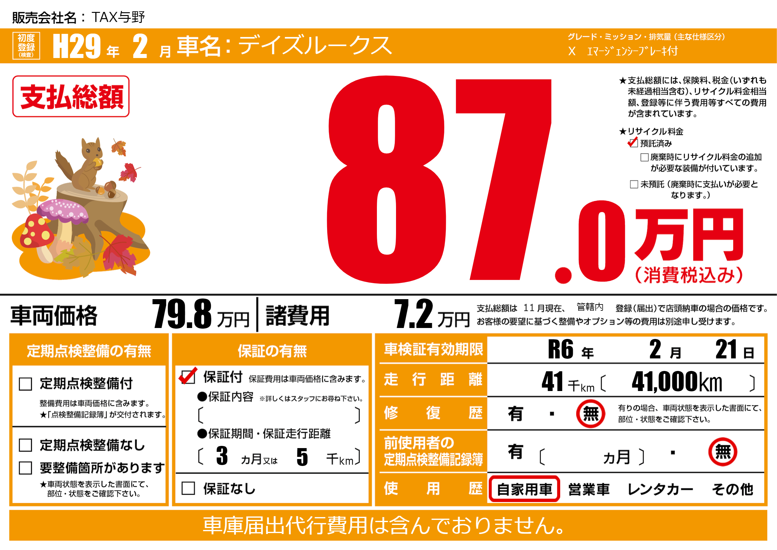 | 走行キロ | 4.1万km | 初年度登録 | H29年2月 |