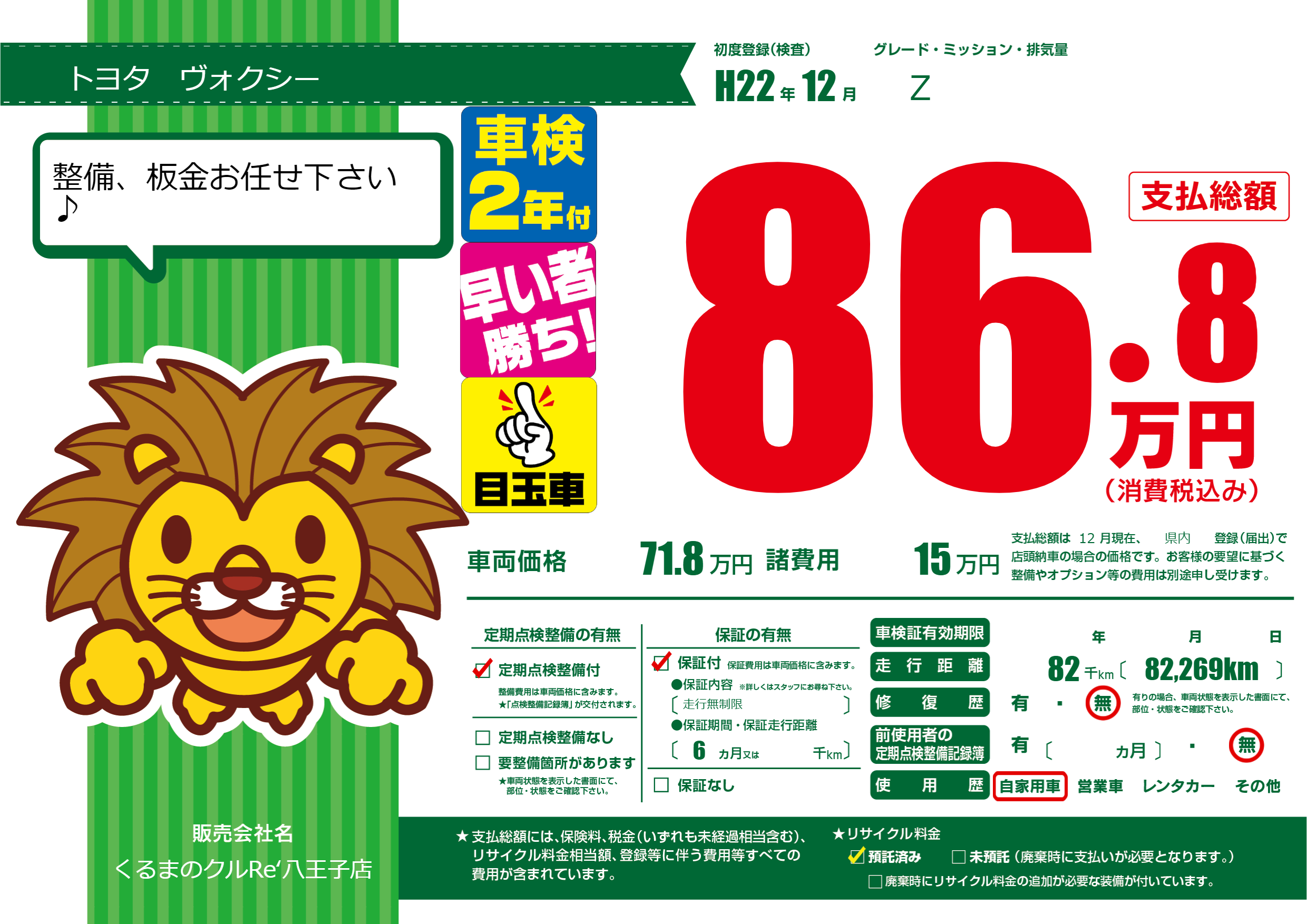 | 走行キロ | 8.2万km | 初年度登録 | H22年12月 |
