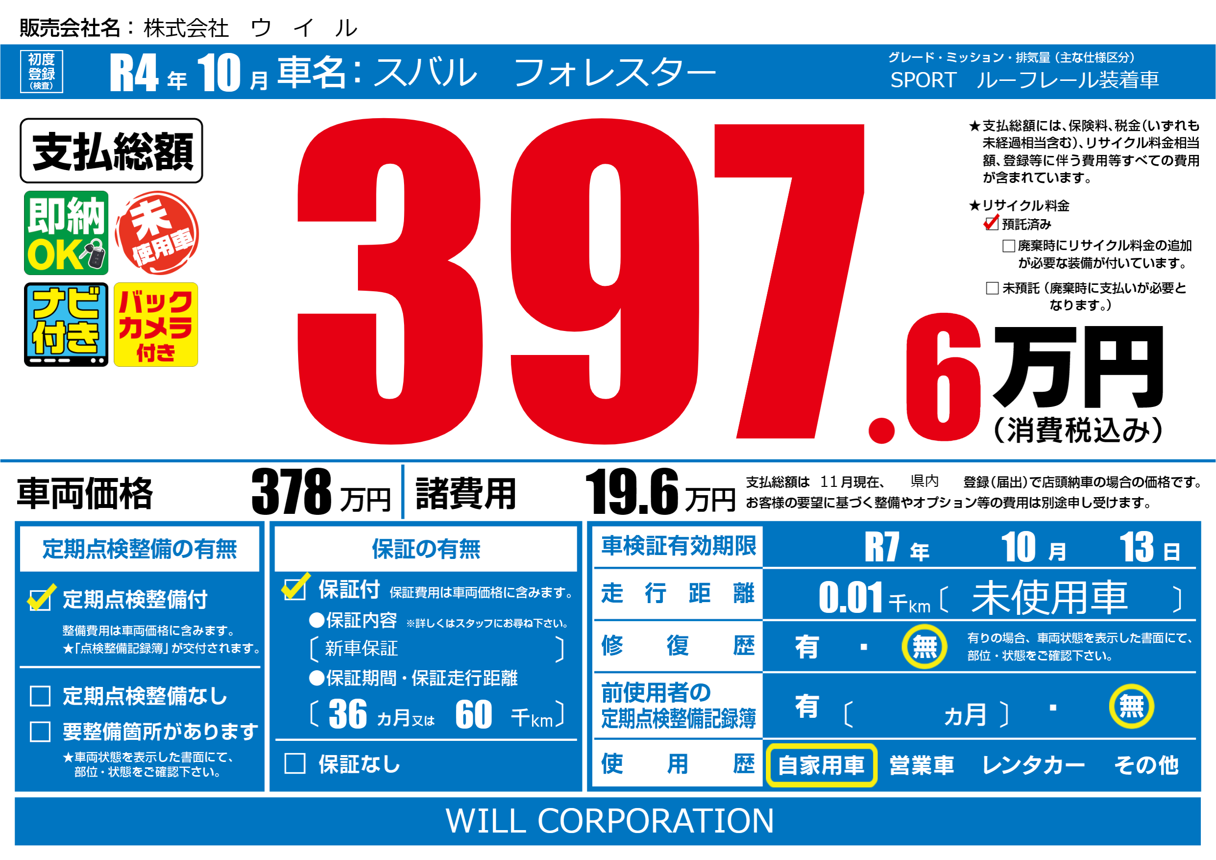 | 車名 | スバル フォレスター | グレード ミッション 排気量 |