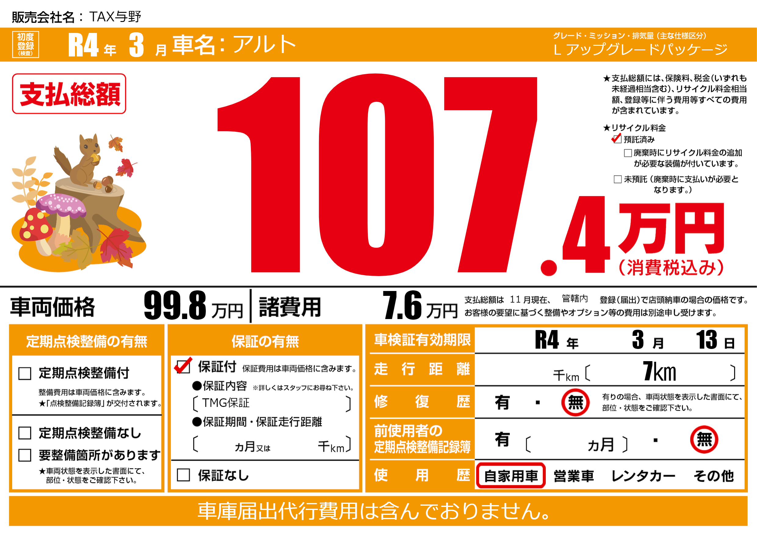 保証付き 保証内容(TMG保証) ---ヶ月または()千kmまで |