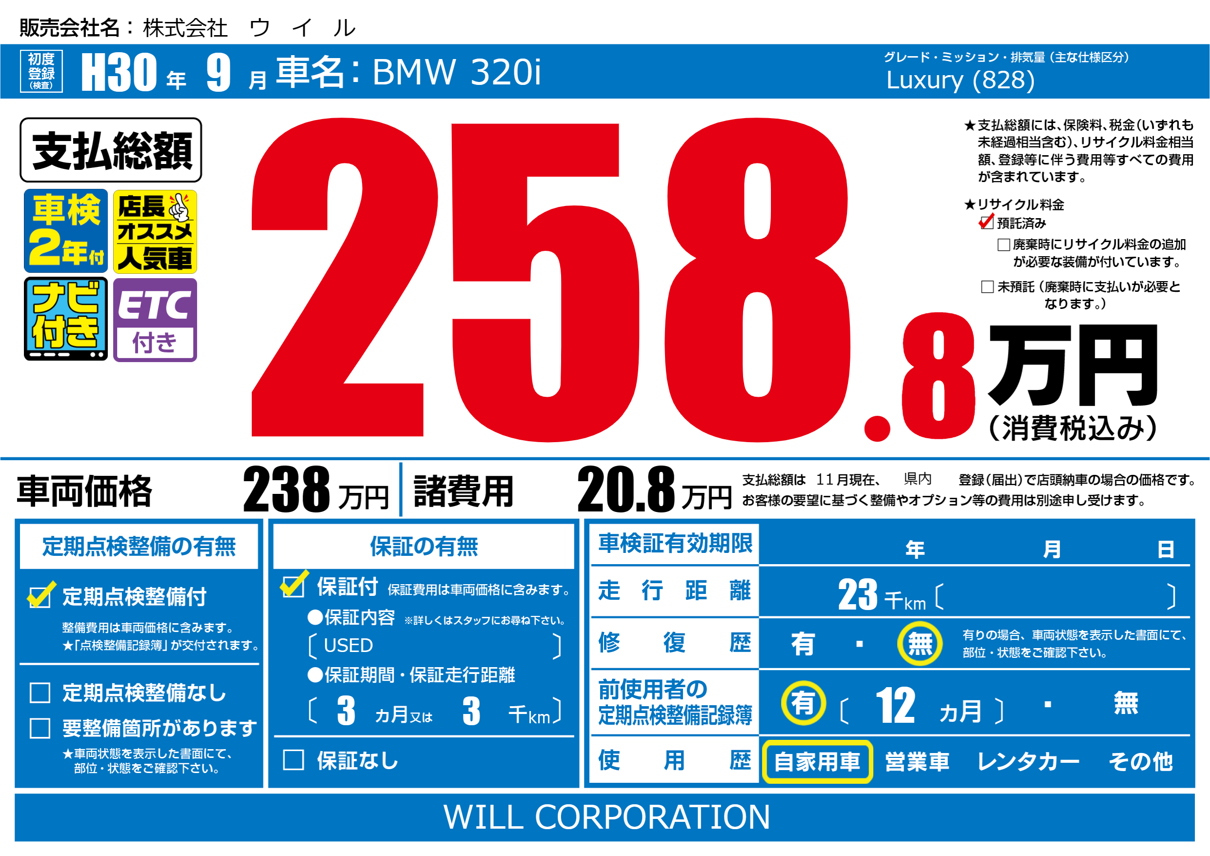 | 走行キロ | 2.3万km | 初年度登録 | H30年9月 |