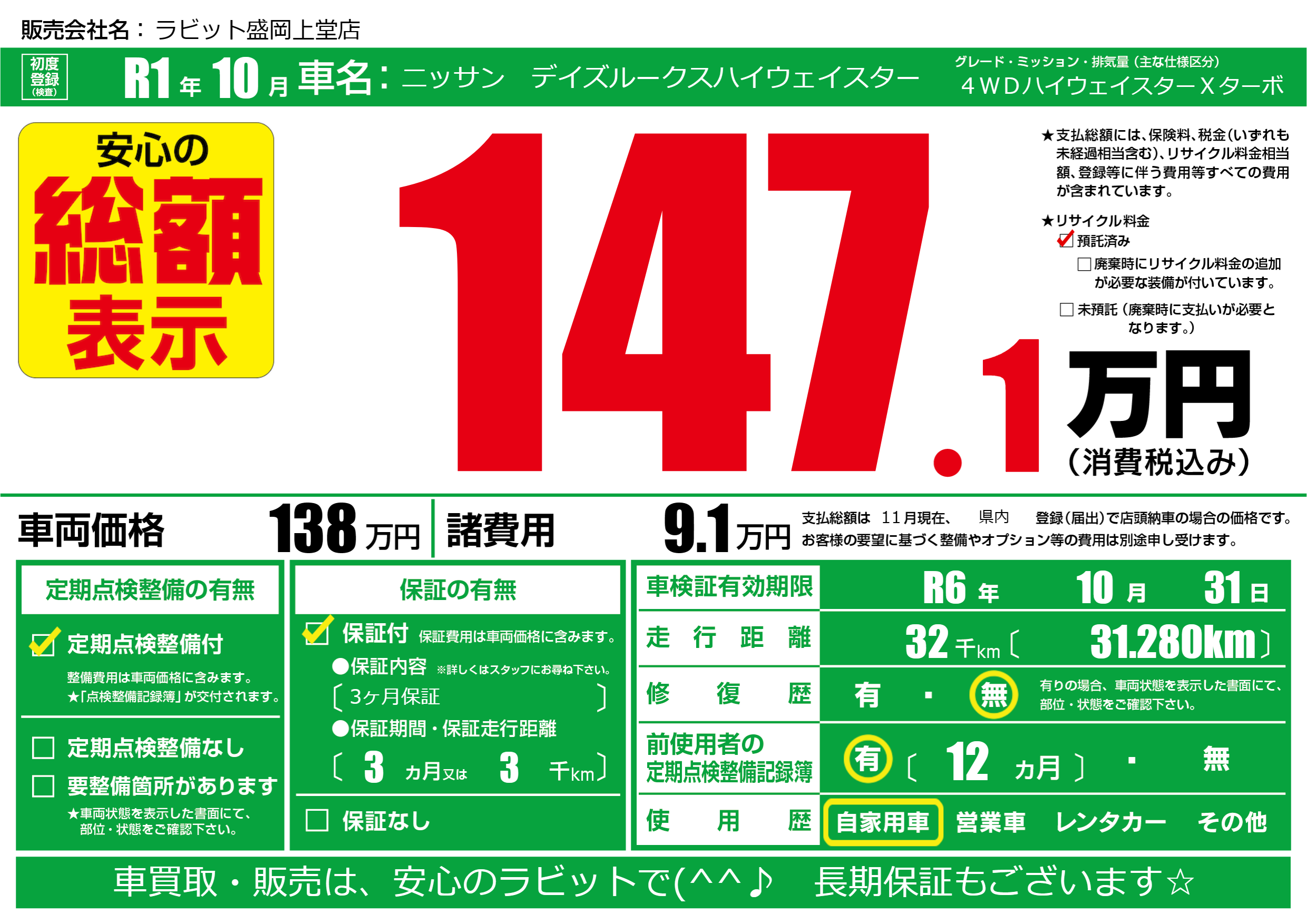 | 走行キロ | 3.2万km | 初年度登録 | R1年10月 |