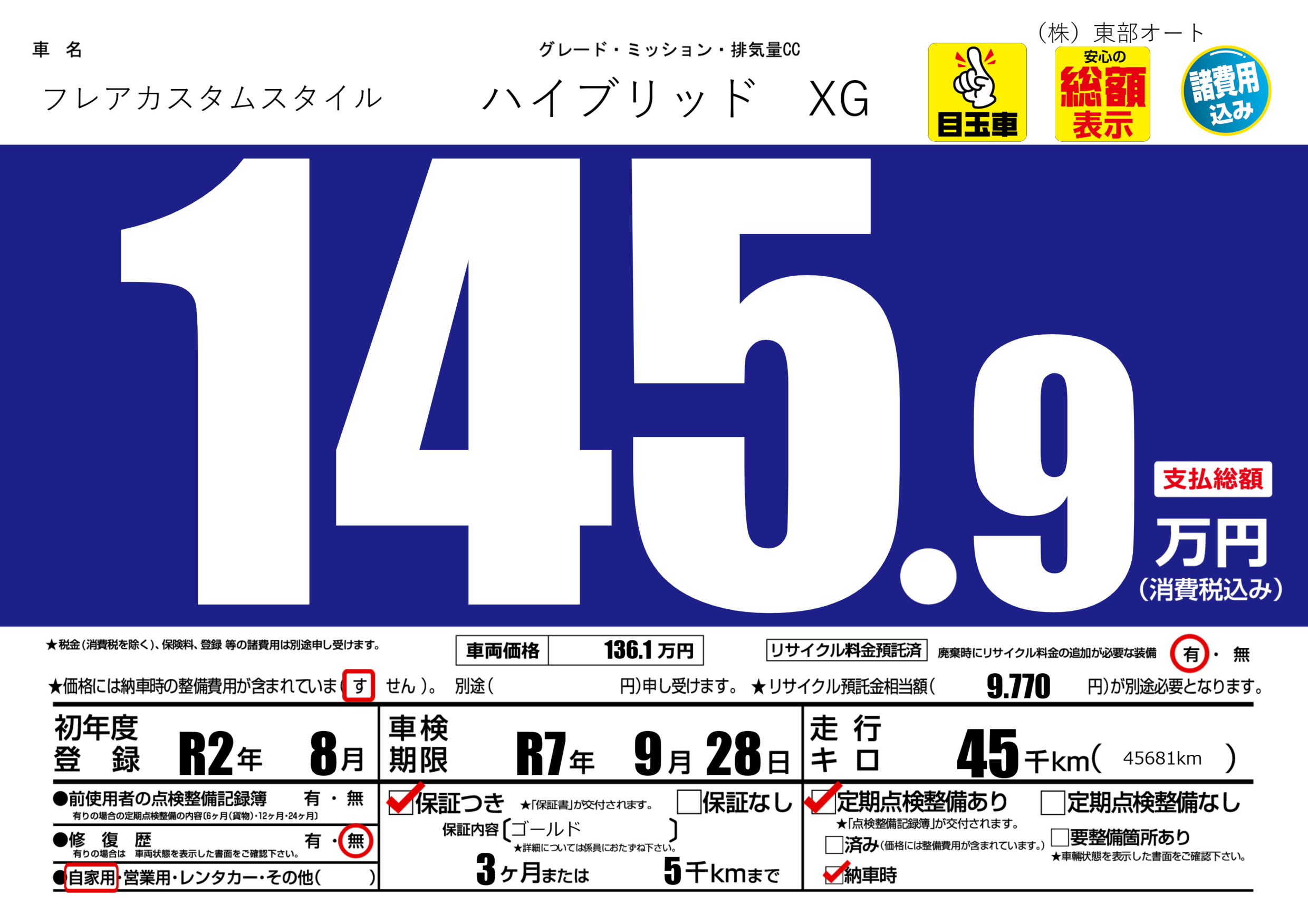 | 車名 | フレアカスタムスタイル | グレード ミッション 排気量 |