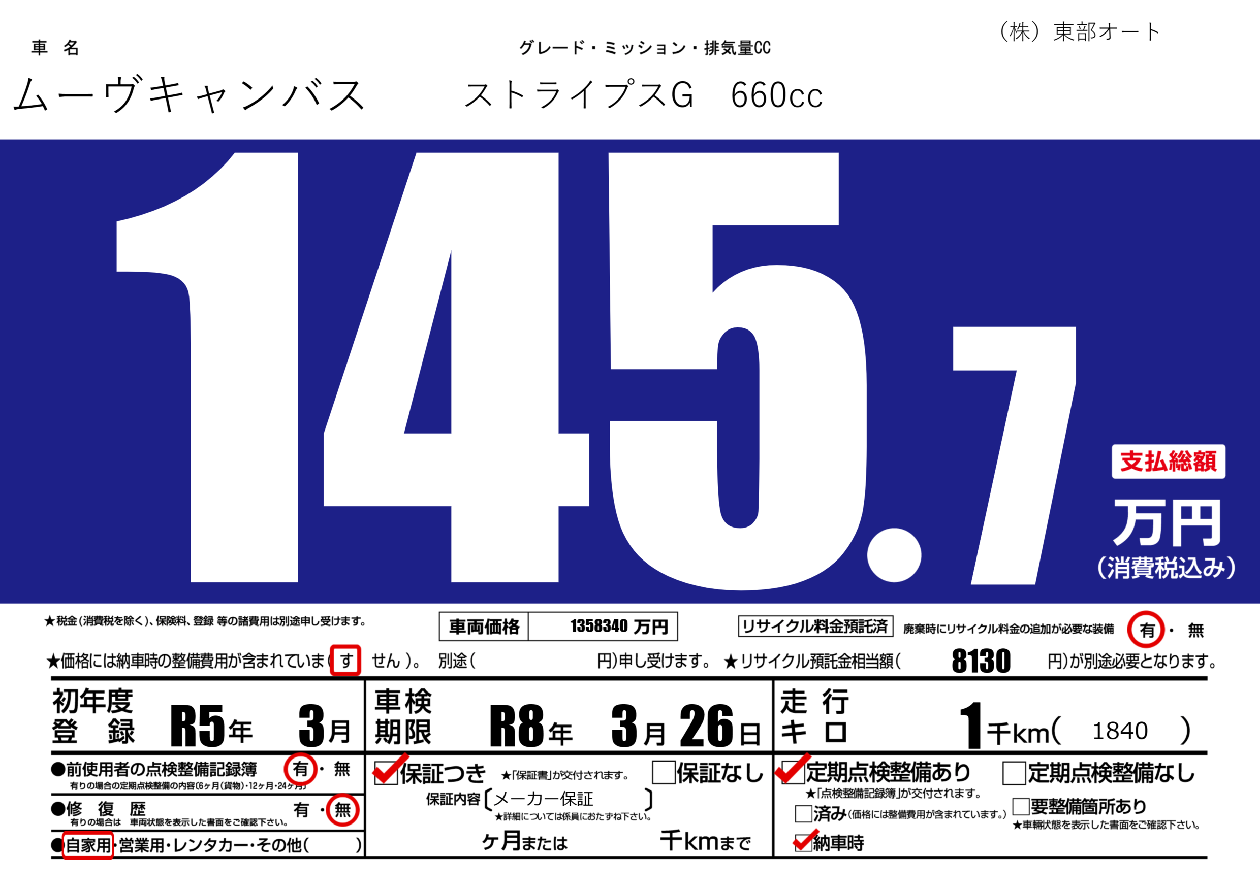 | 走行キロ | 0.1万km | 初年度登録 | R5年3月 |