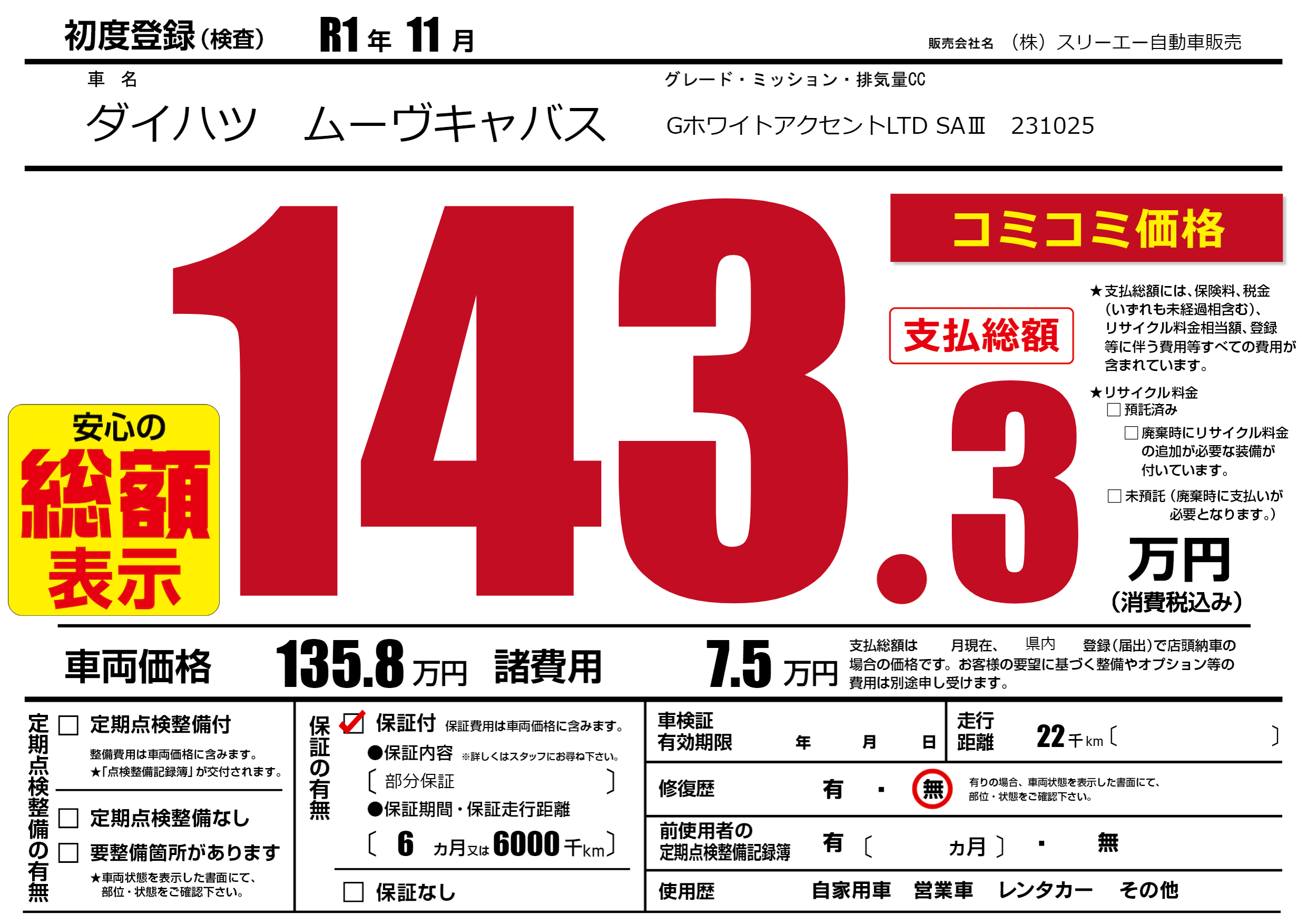 保証付き 保証内容(部分保証) 6ヶ月または(6000)千kmまで |