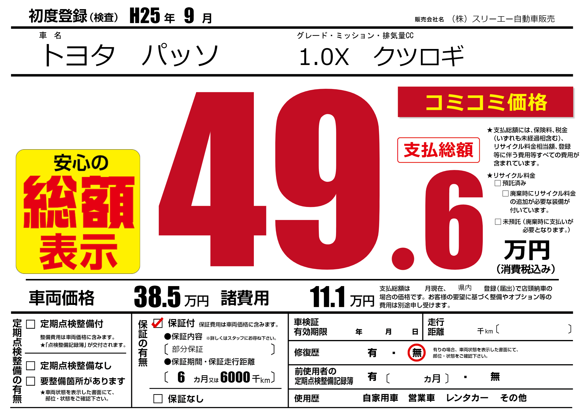 | 車名 | トヨタ パッソ | グレード ミッション 排気量 |