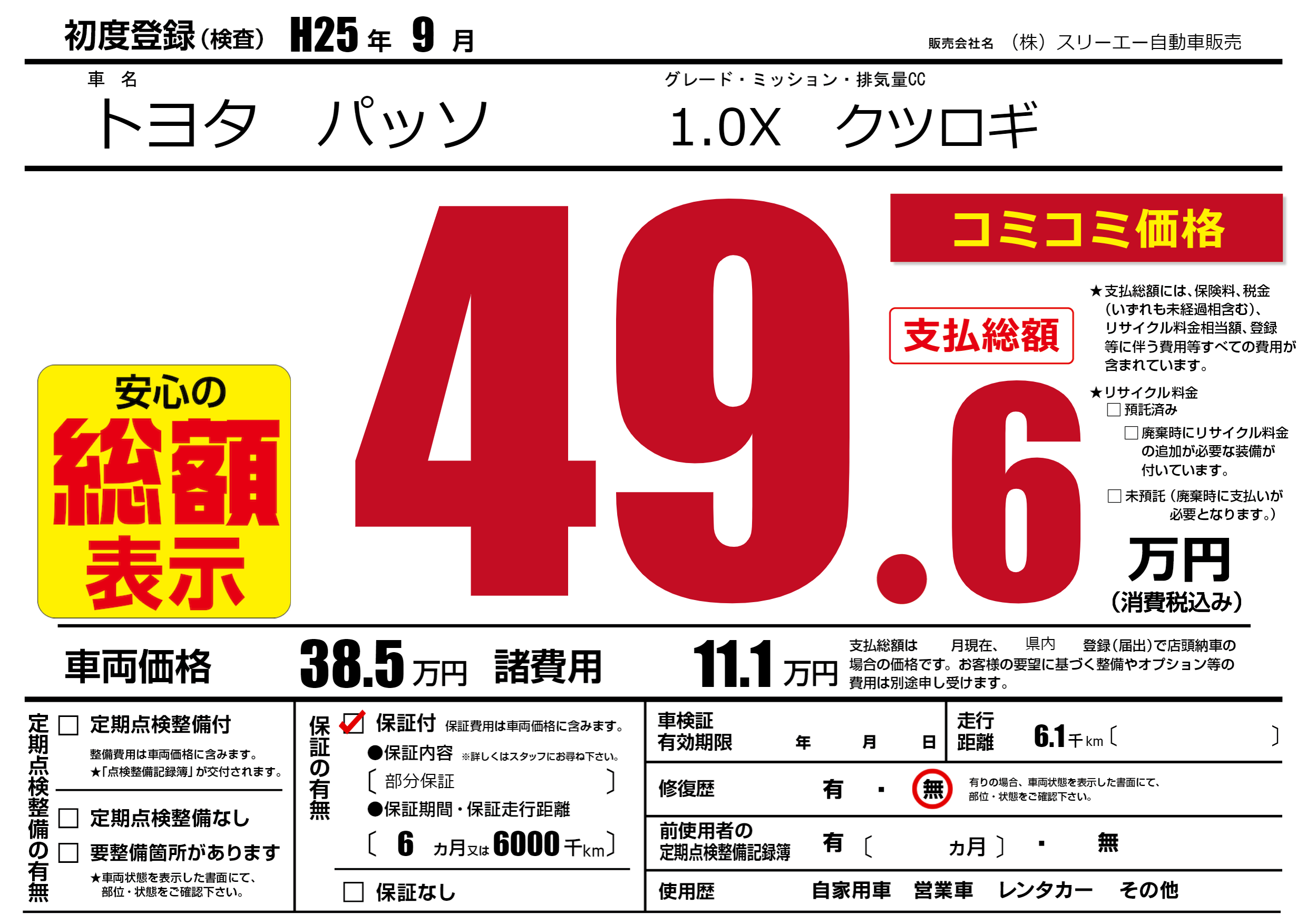 | 車名 | トヨタ パッソ | グレード ミッション 排気量 |