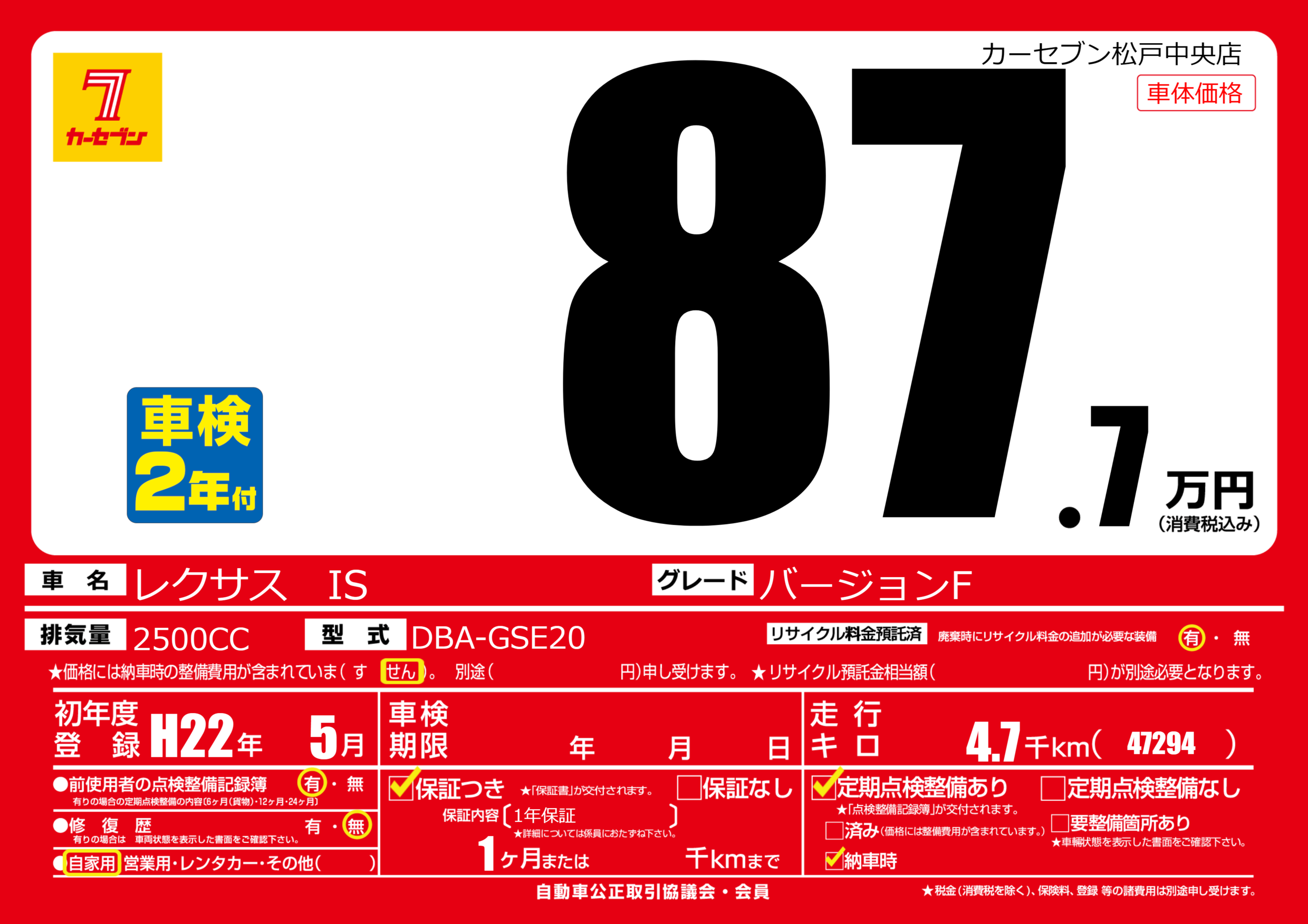 | 車名 | レクサス IS | グレード ミッション 排気量 |