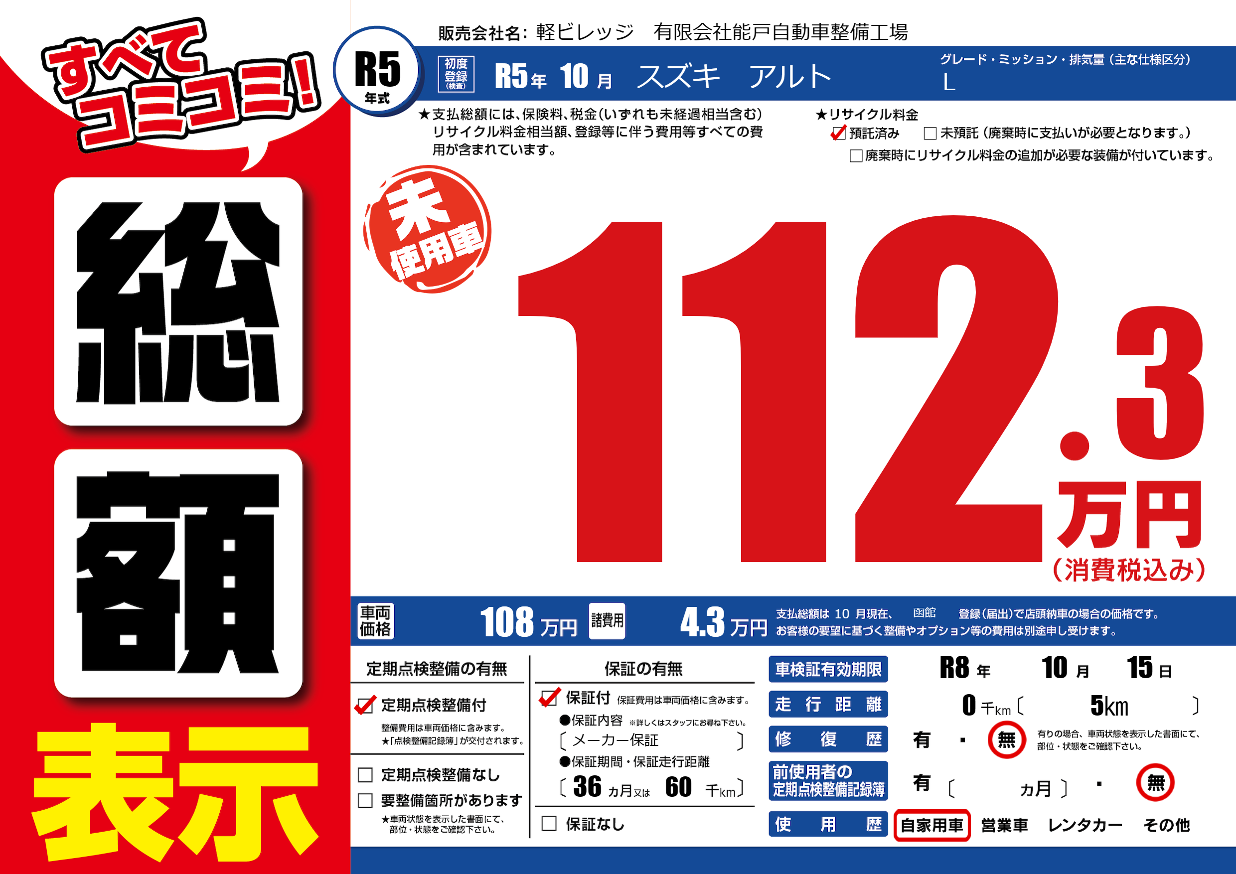 | 車名 | スズキ アルト | グレード ミッション 排気量 |