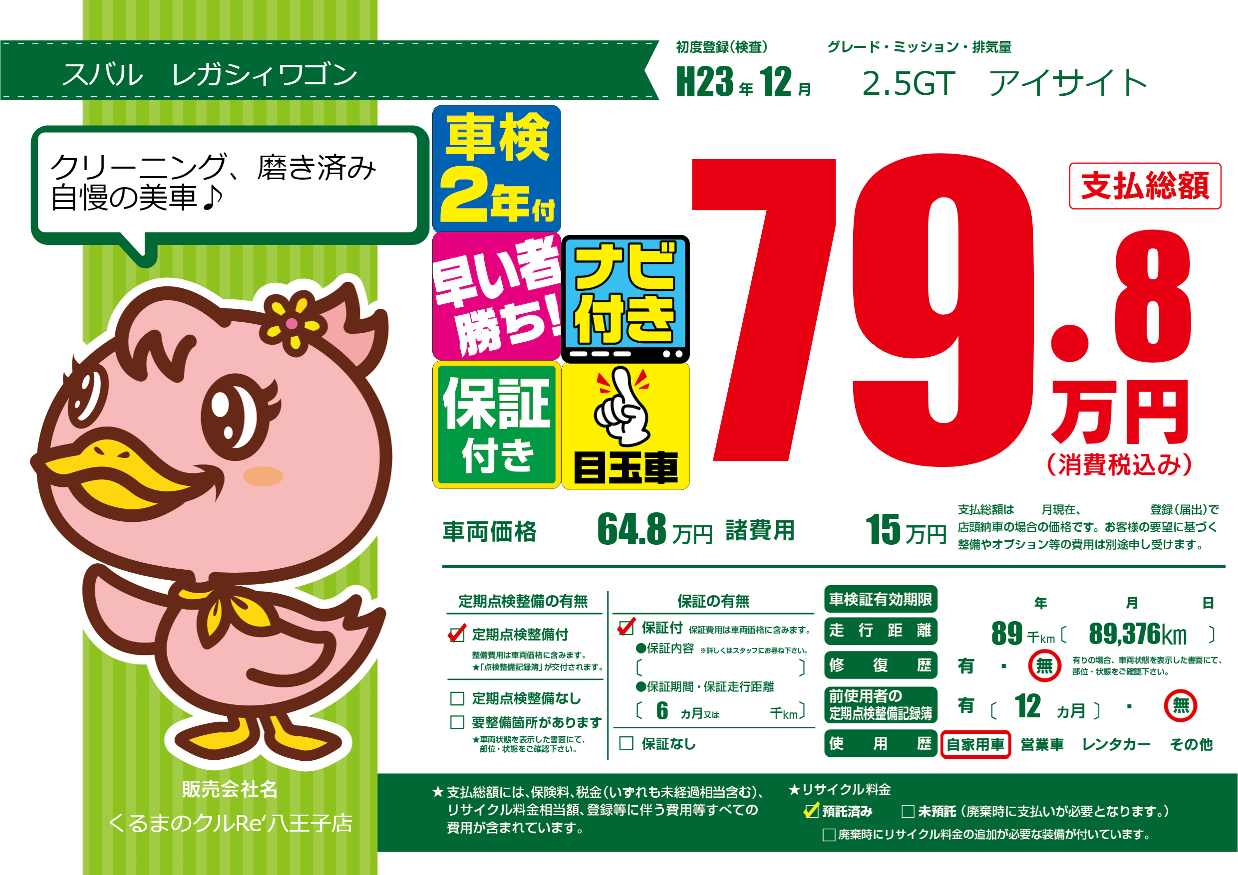 | 走行キロ | 8.9万km | 初年度登録 | H23年12月 |