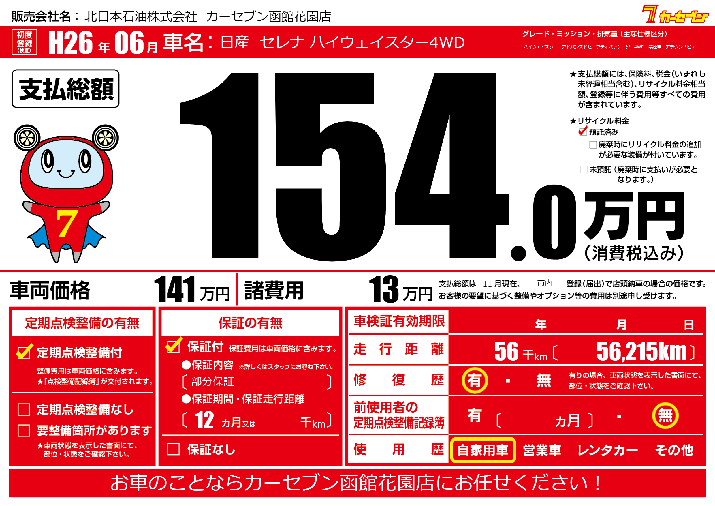 | 車名 | 日産 セレナ ハイウェイスター4WD | グレード ミッション 排気量 |