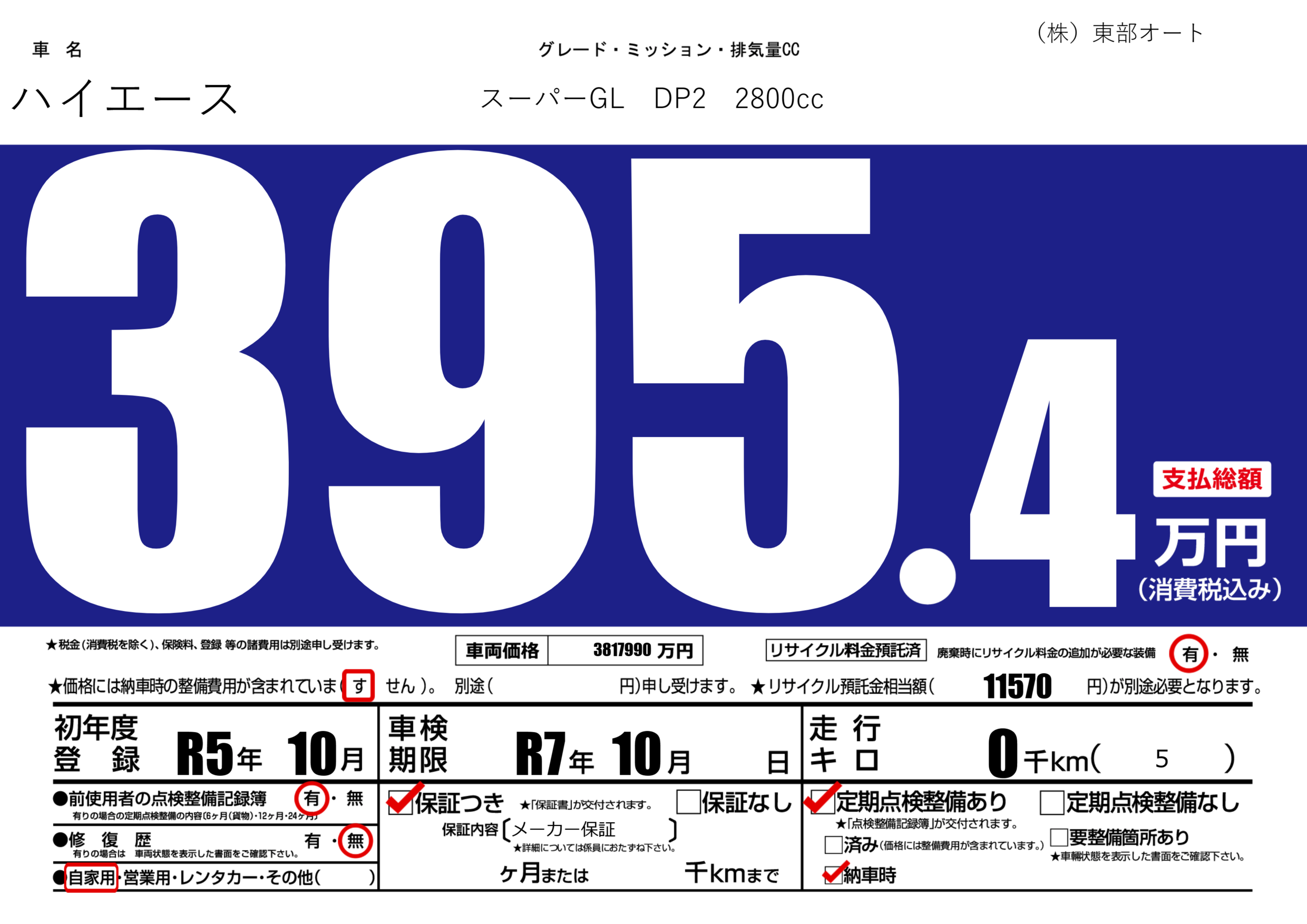 | 車名 | ハイエース | グレード ミッション 排気量 |