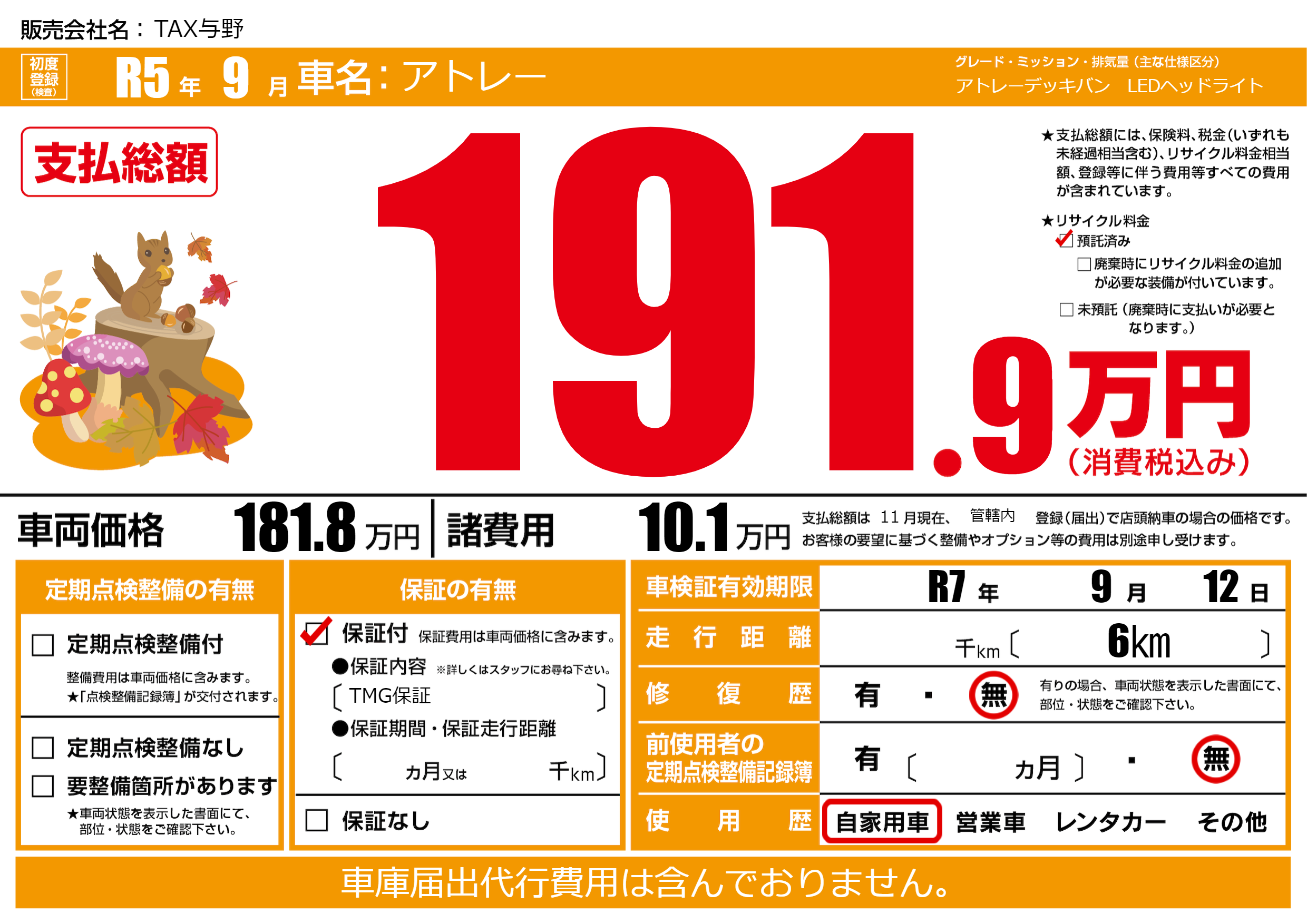 | 走行キロ | - | 初年度登録 | R5年9月 |