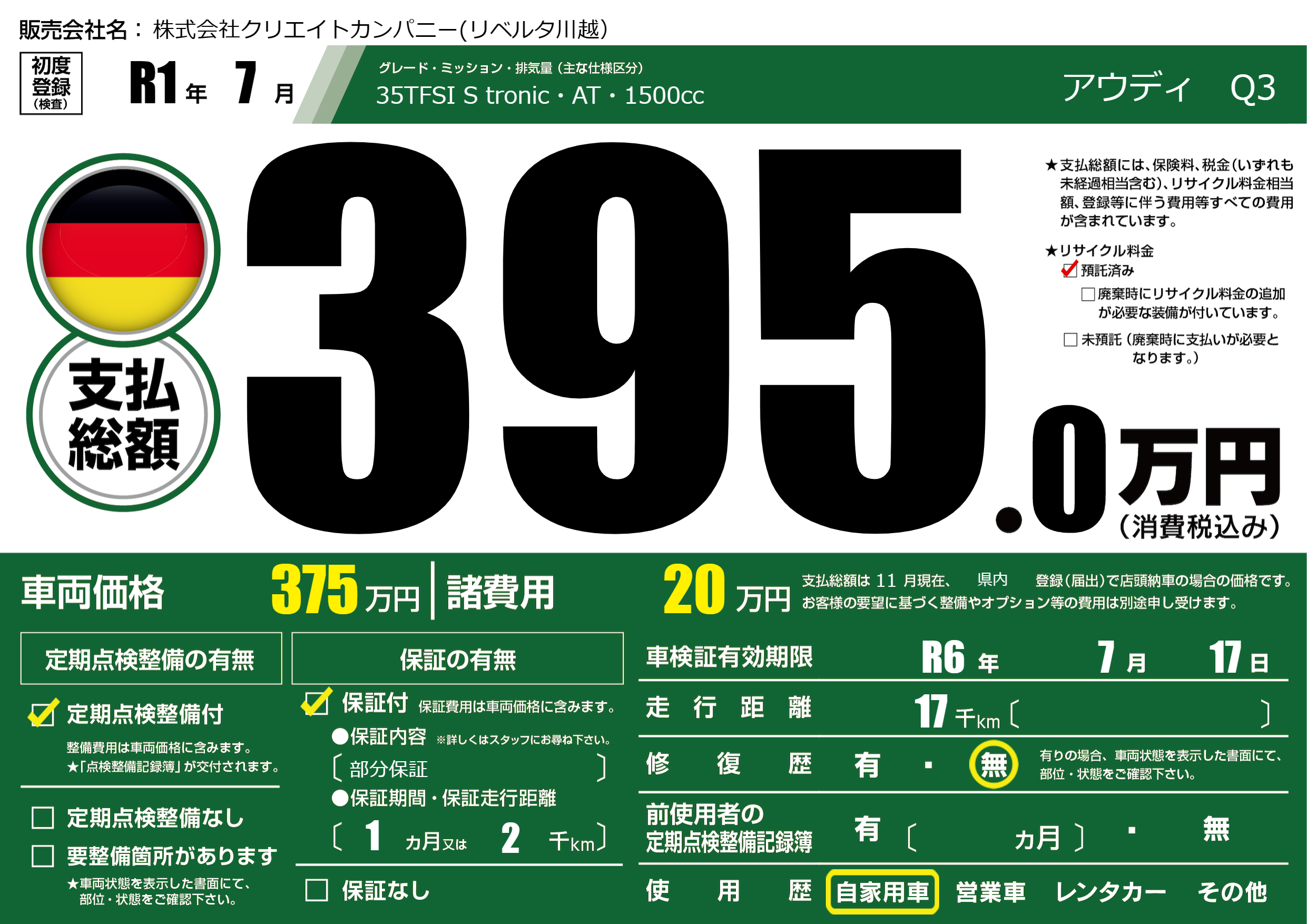 | 車名 | アウディ Q3 | グレード ミッション 排気量 |