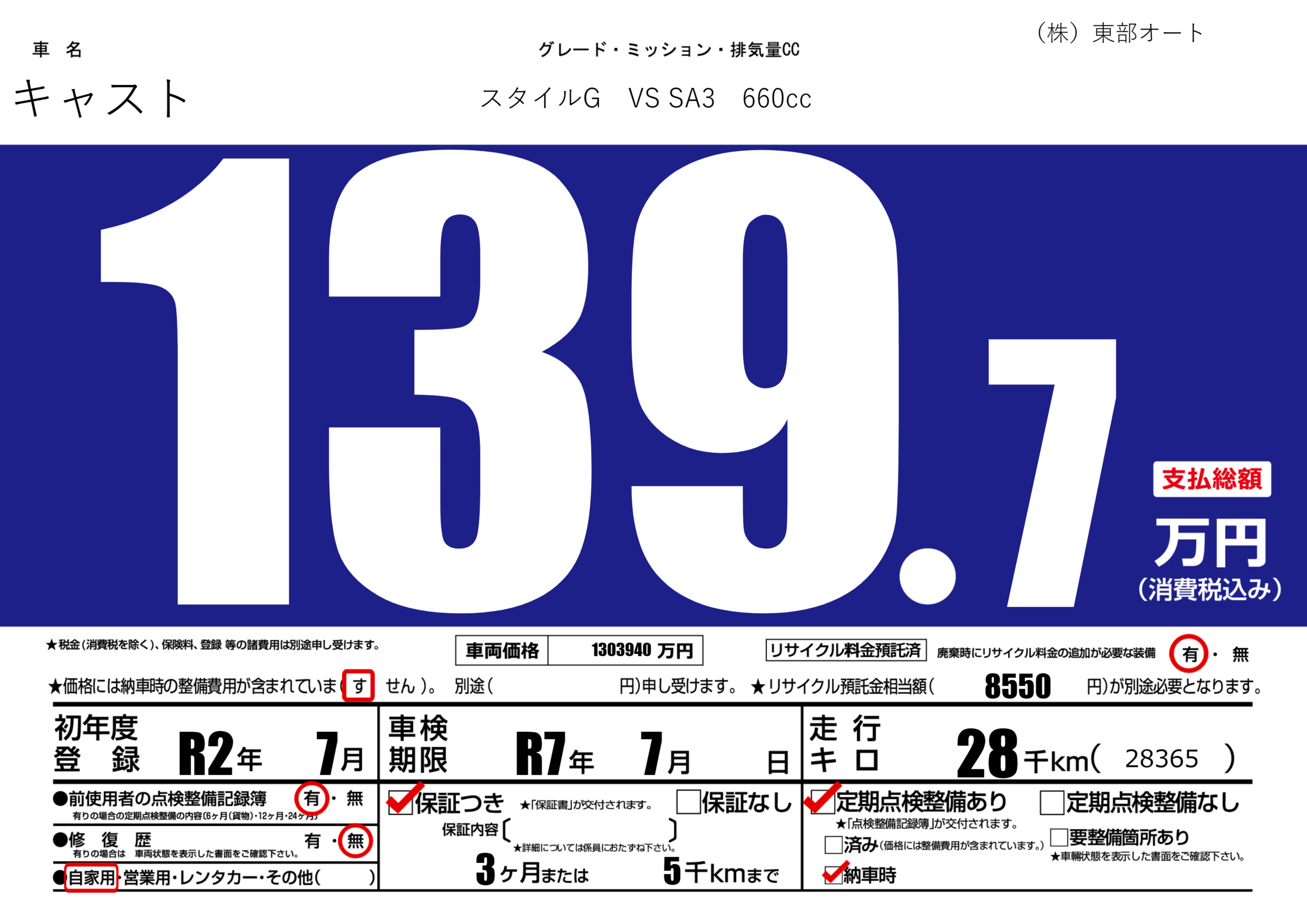 保証付き 保証内容(---) 3ヶ月または(5)千kmまで |