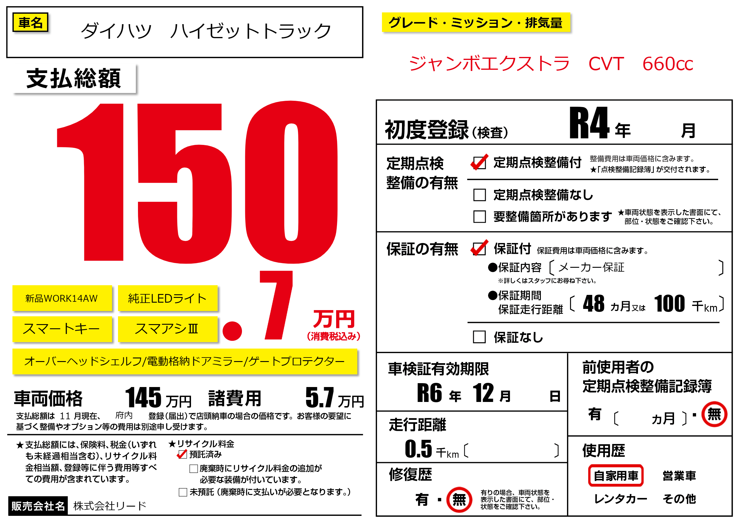 | 走行キロ | - | 初年度登録 | R4年---月 |