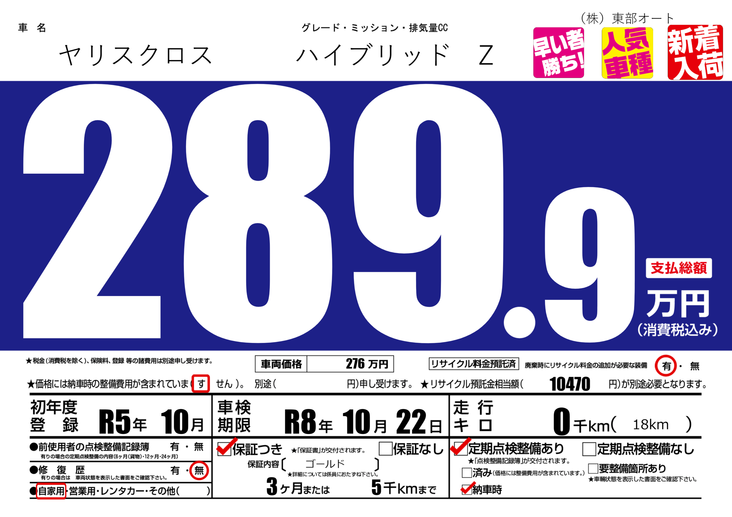 | 車名 | ヤリスクロス | グレード ミッション 排気量 |