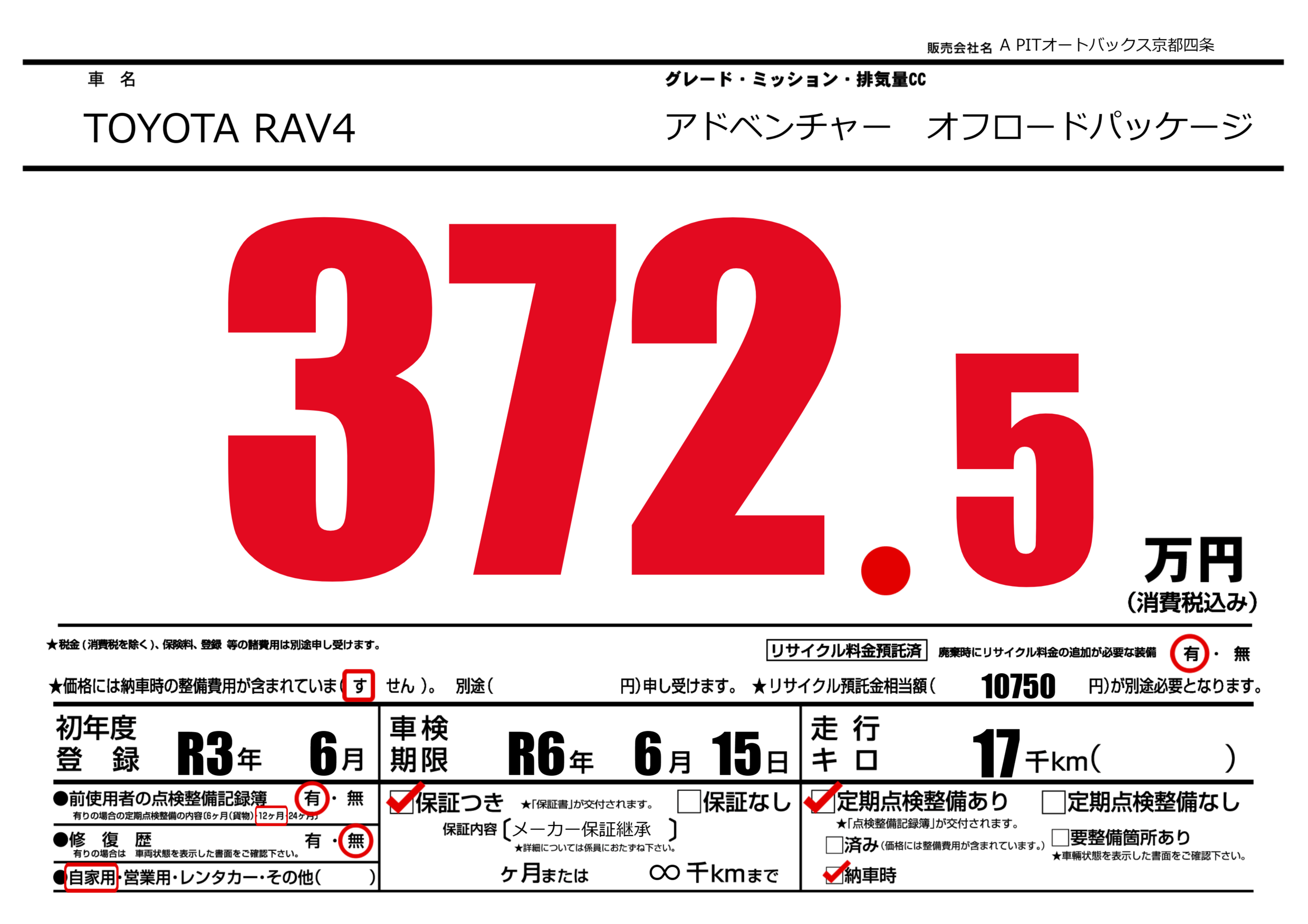 | 車名 | TOYOTA RAV4 | グレード ミッション 排気量 |