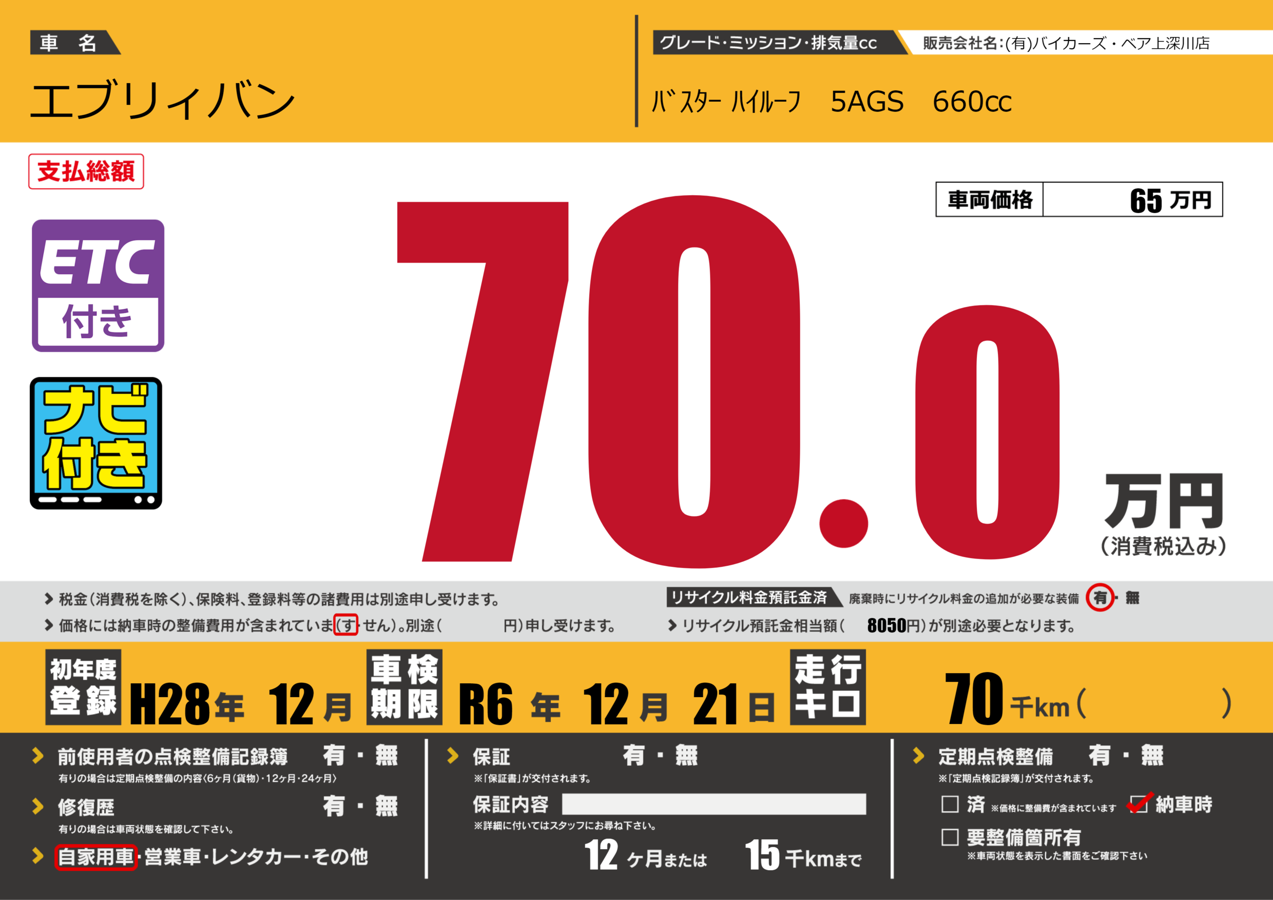 | 車検制限 | R6年 12月 21日 | ||