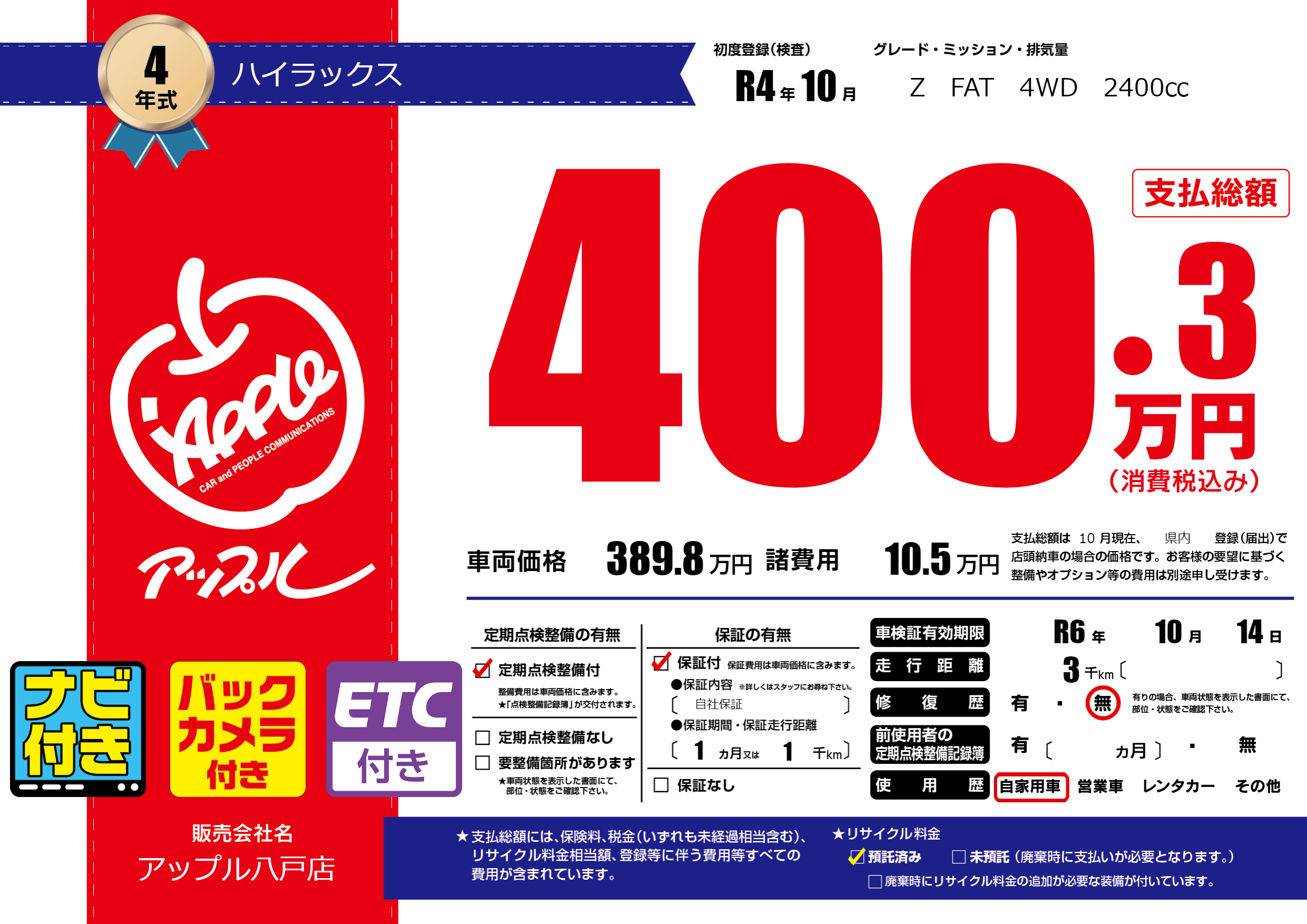 | 走行キロ | 0.3万km | 初年度登録 | R4年10月 |