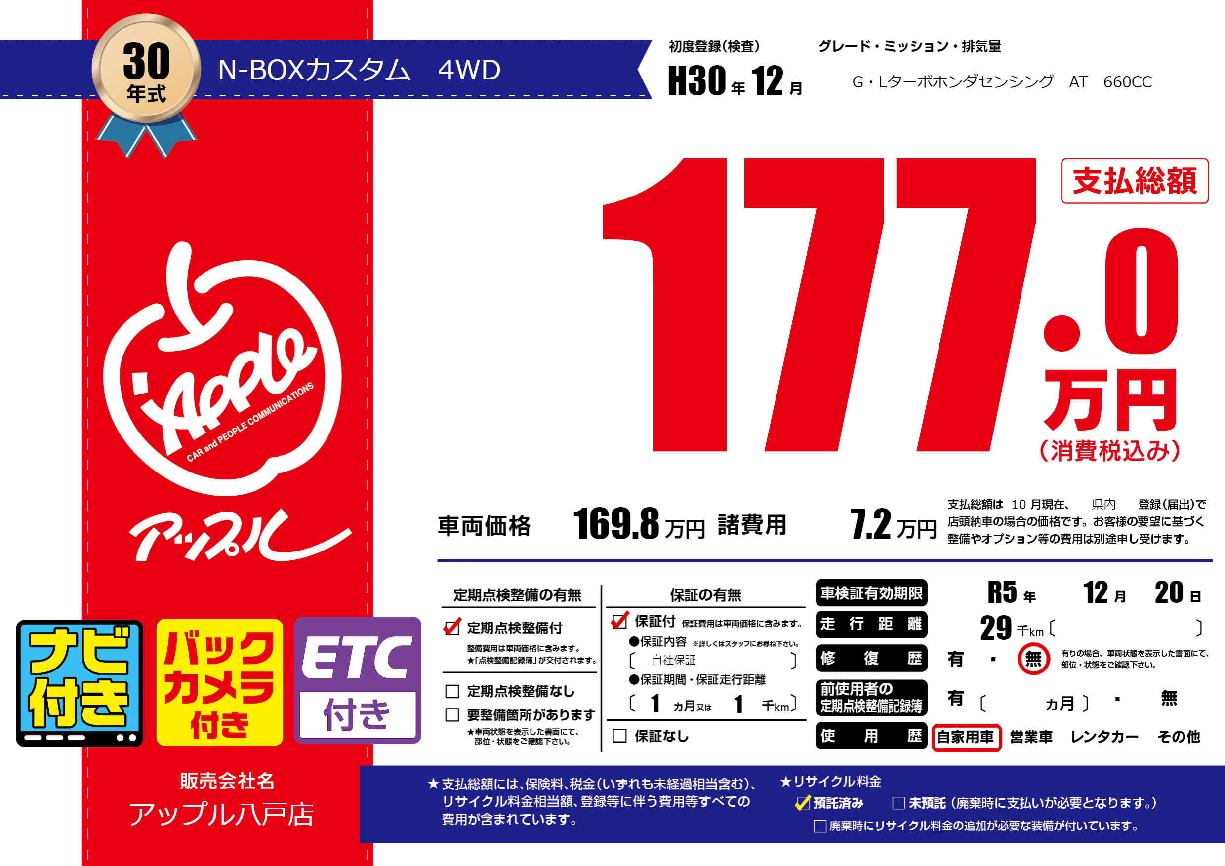 | 車名 | N-BOXカスタム 4WD | グレード ミッション 排気量 |