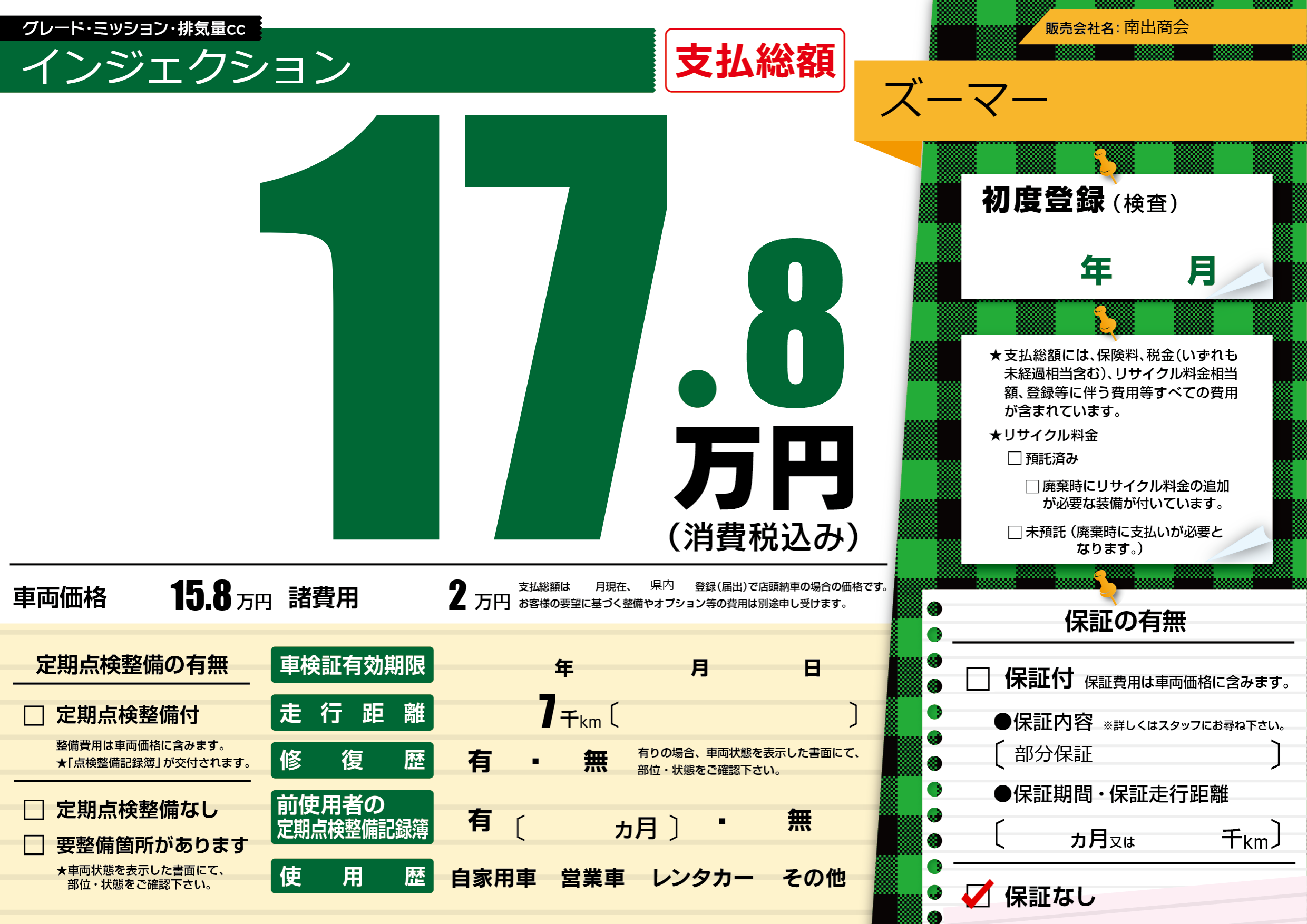 保証なし 保証内容(部分保証) ---ヶ月または()千kmまで |