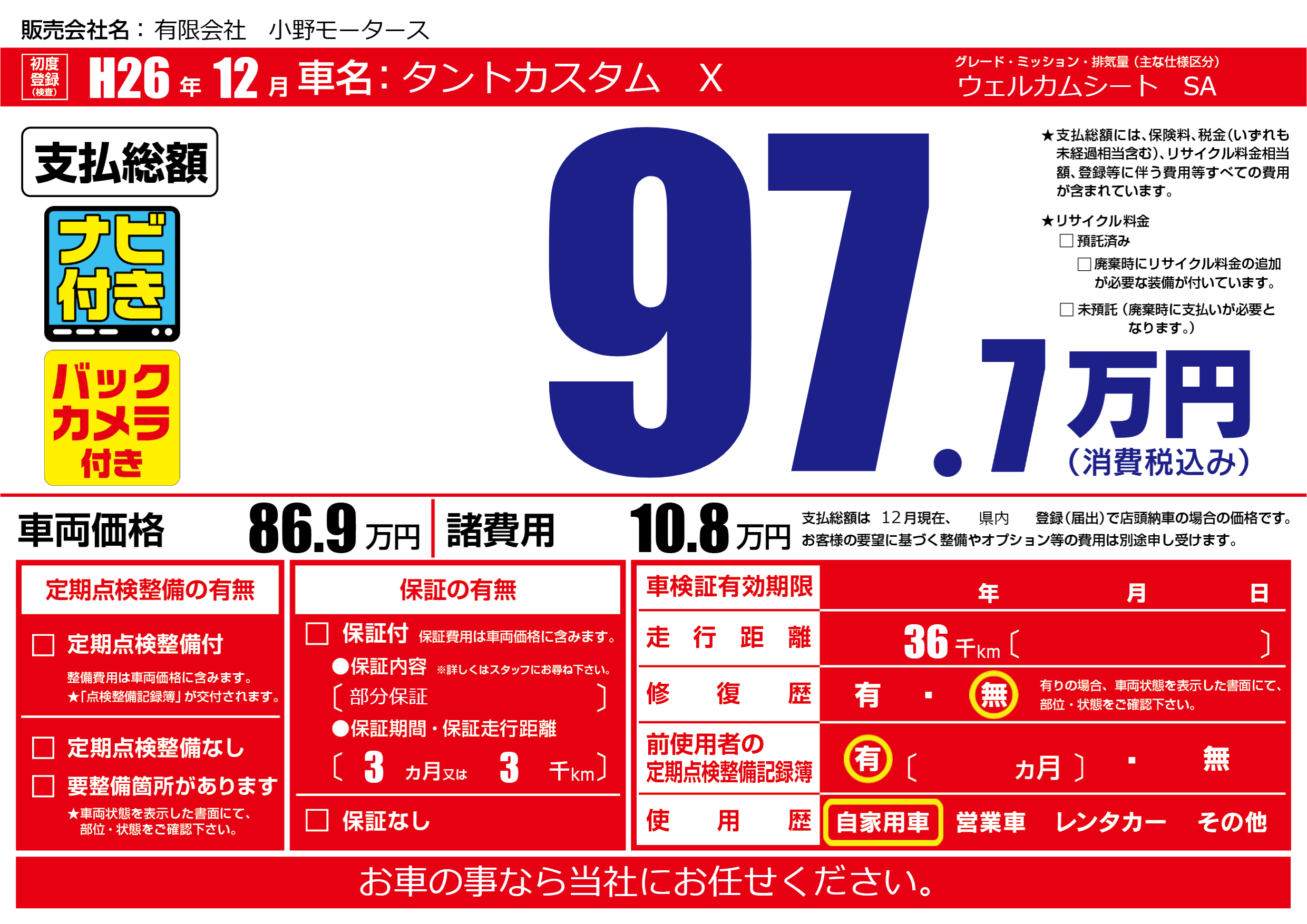 | 車名 | タントカスタム X | グレード ミッション 排気量 |