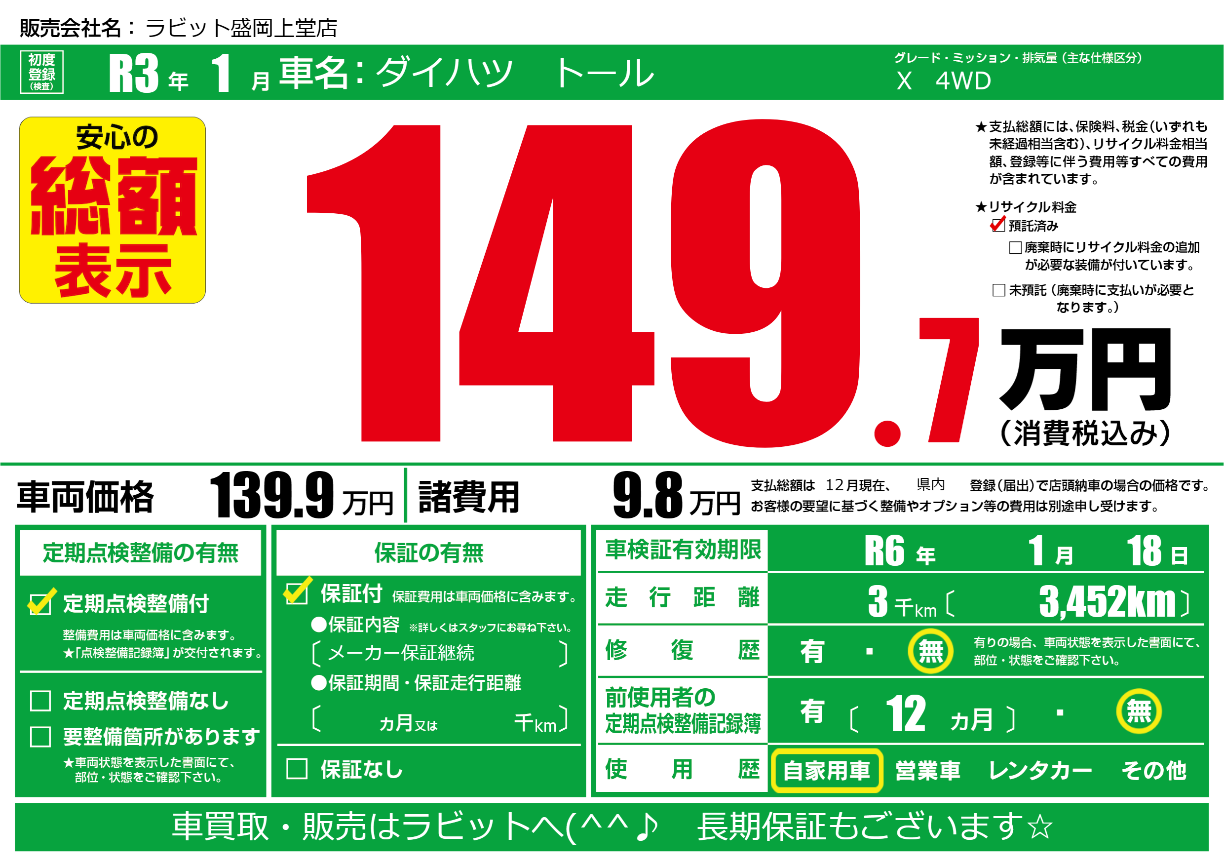 | 車検制限 | R6年 1月 18日 | ||