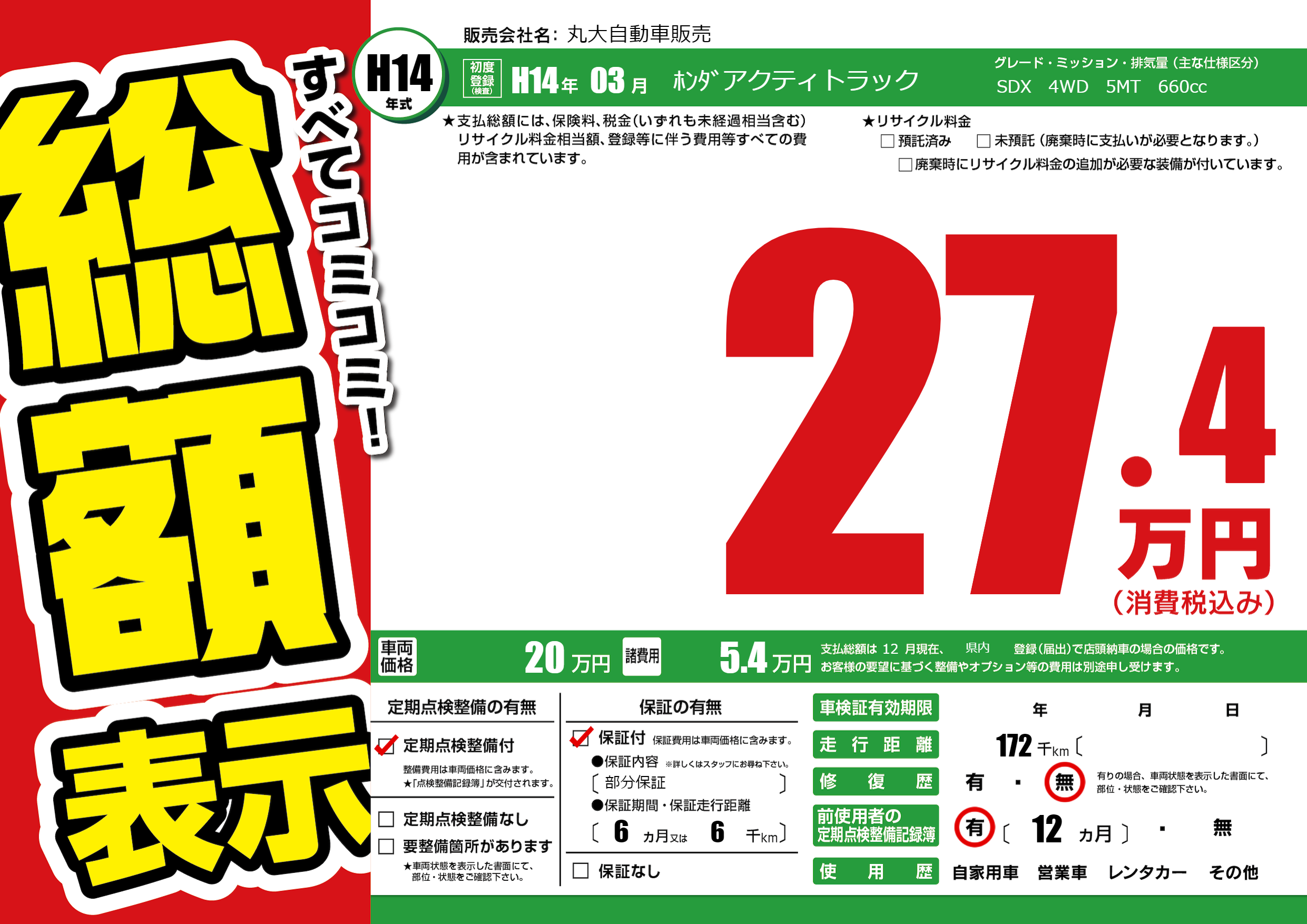 | 車名 | ホンダアクティトラック | グレード ミッション 排気量 |