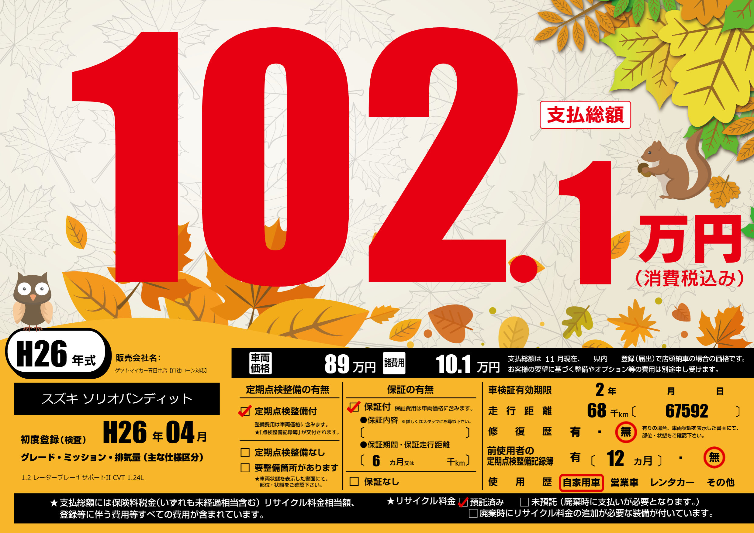 | 車名 | スズキ ソリオバンディット | グレード ミッション 排気量 |