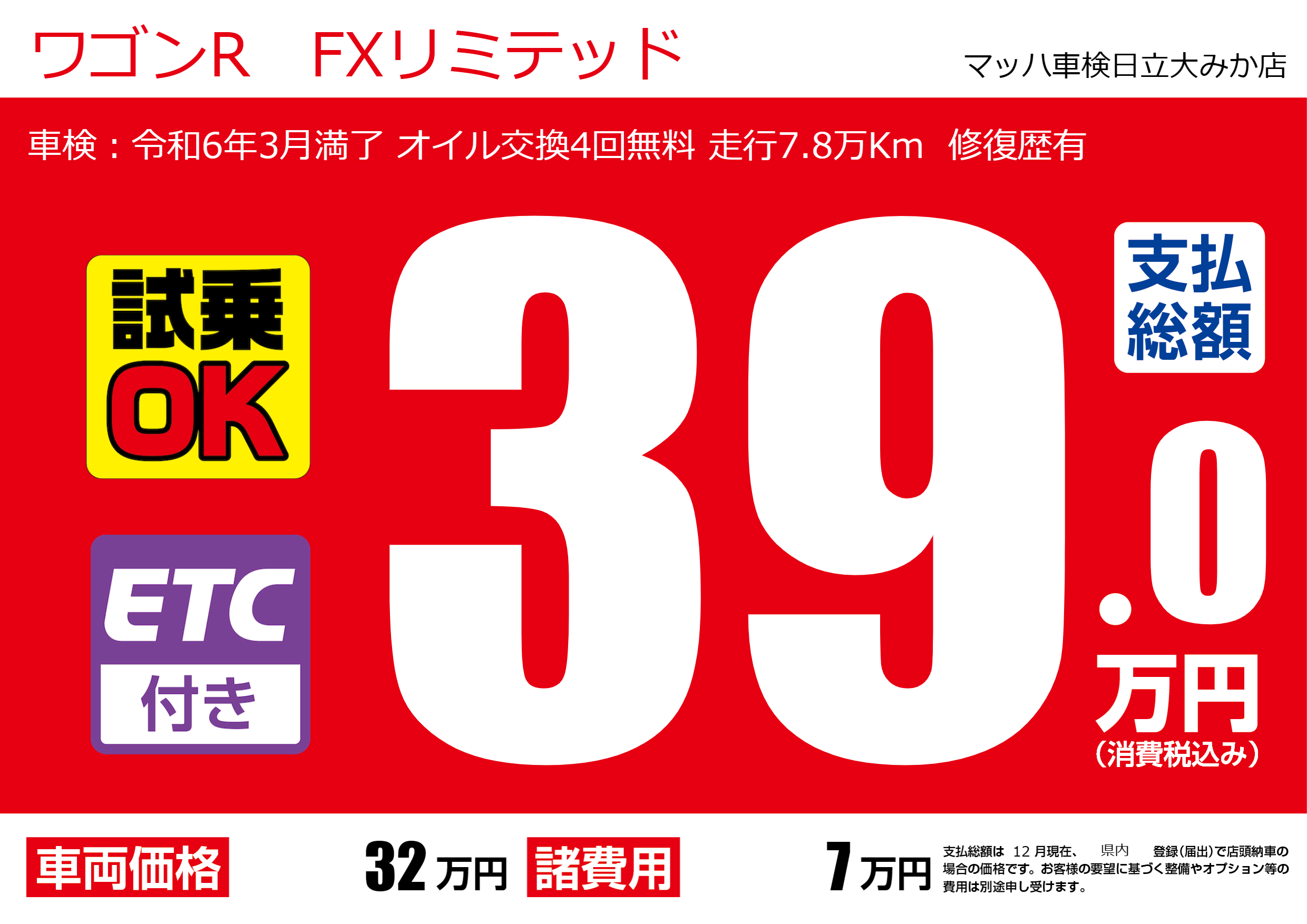 車検:令和6年3月満了 オイル交換4回無料 走行7.8万Km 修復歴有 |