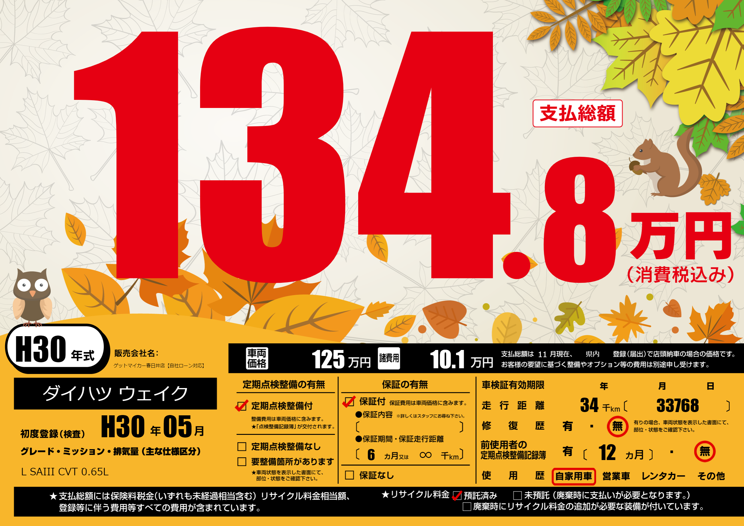 | 走行キロ | 3.4万km | 初年度登録 | H30年05月 |