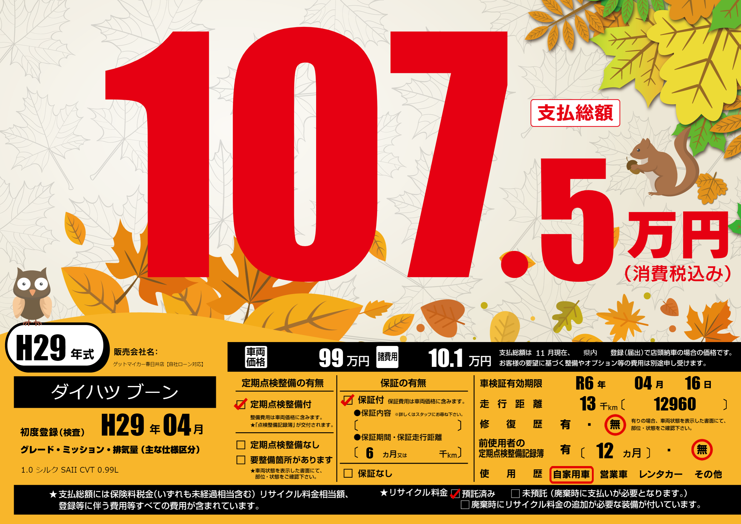 | 車名 | ダイハツ ブーン | グレード ミッション 排気量 |